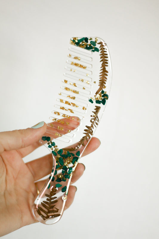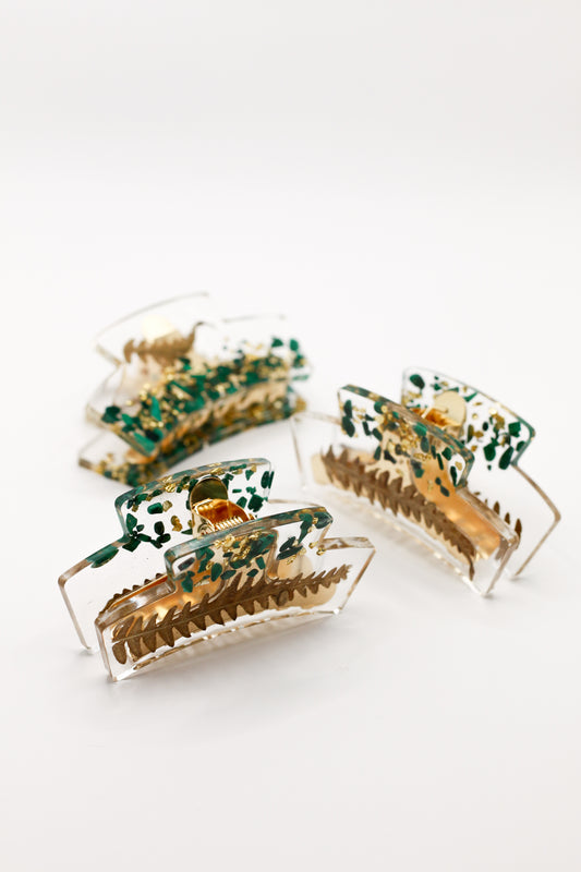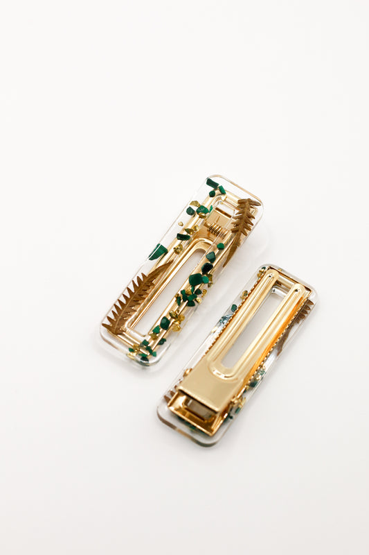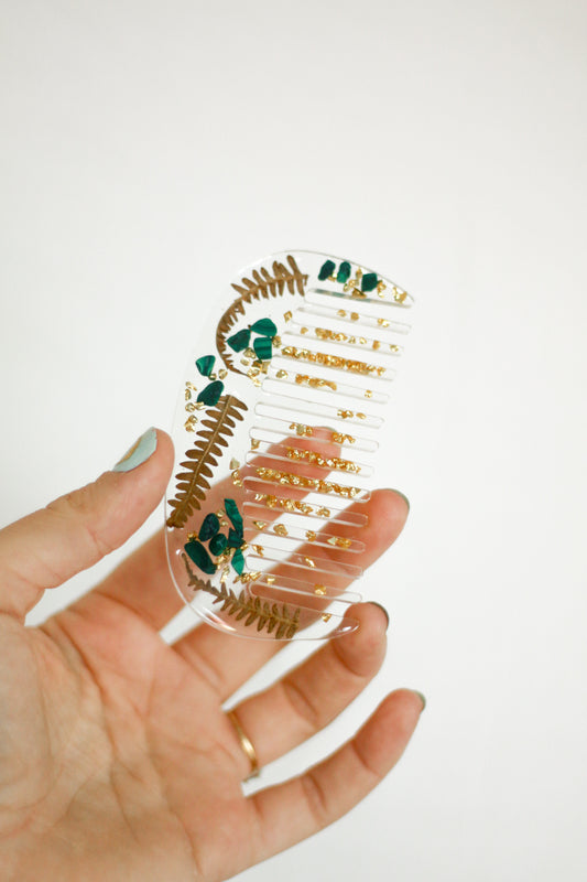 La série malachite est un ensemble de créations originales (bijoux, accessoires à cheveux, marque-pages, boucles d'oreilles), incrustées de fougères et de malachite, une pierre aux teintes vertes envoutantes.