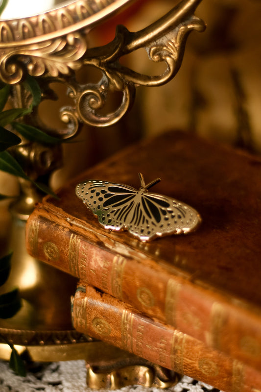 Cabinet of Curiosities is the flagship collection of La Boutique Lunaire, the one with which it all began. It consists of pins representing butterflies under bell jars, a palmistry hand, insects, but also illustrations of studies of beetles or butterflies, and other original creations reflecting the mysterious and bewitching world of a cabinet of curiosities.