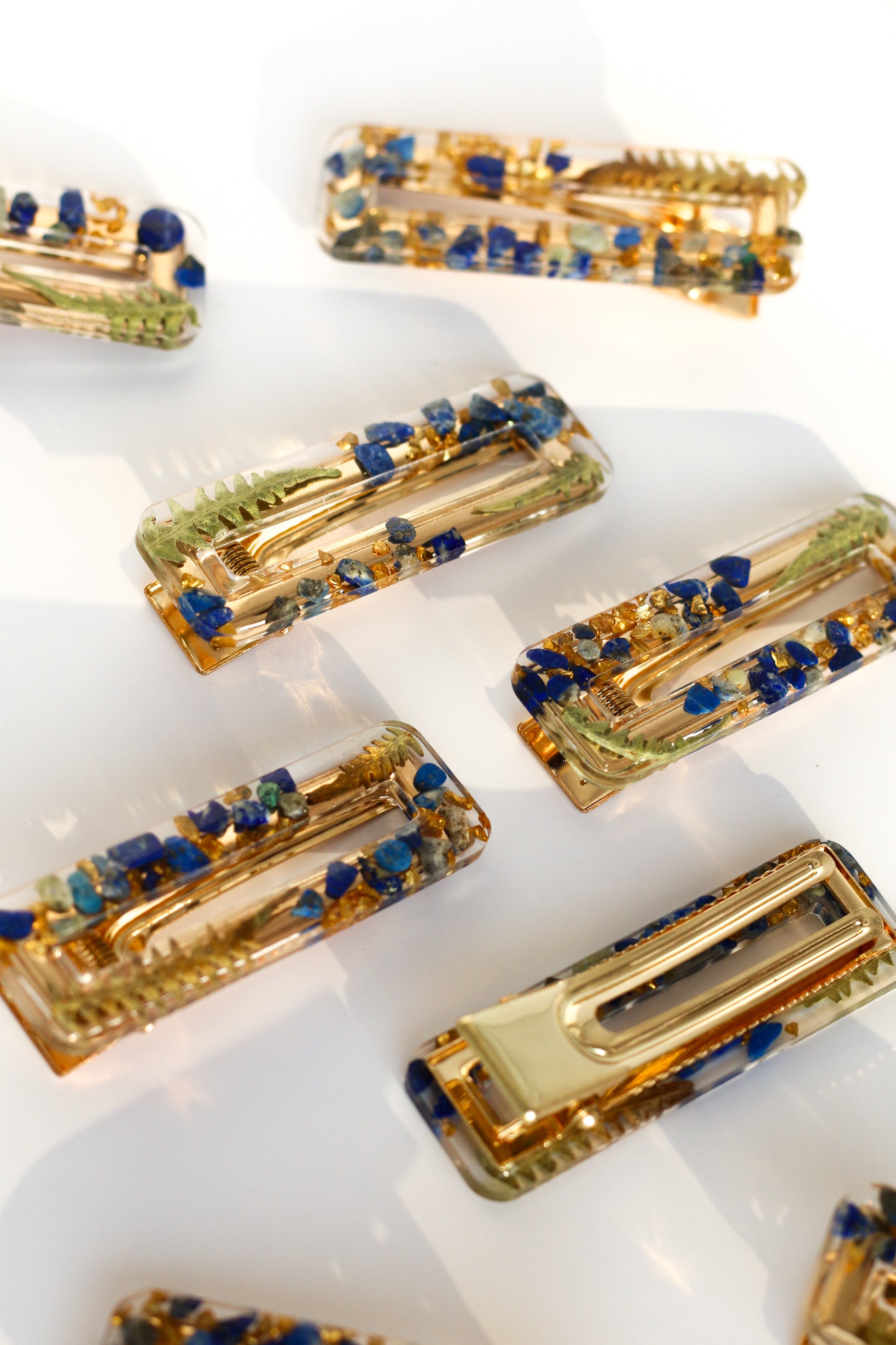 Les barrettes lunaires sont des créations fait main, incrustées de véritables fougères naturelles cueillies localement, et de lapis-lazuli.