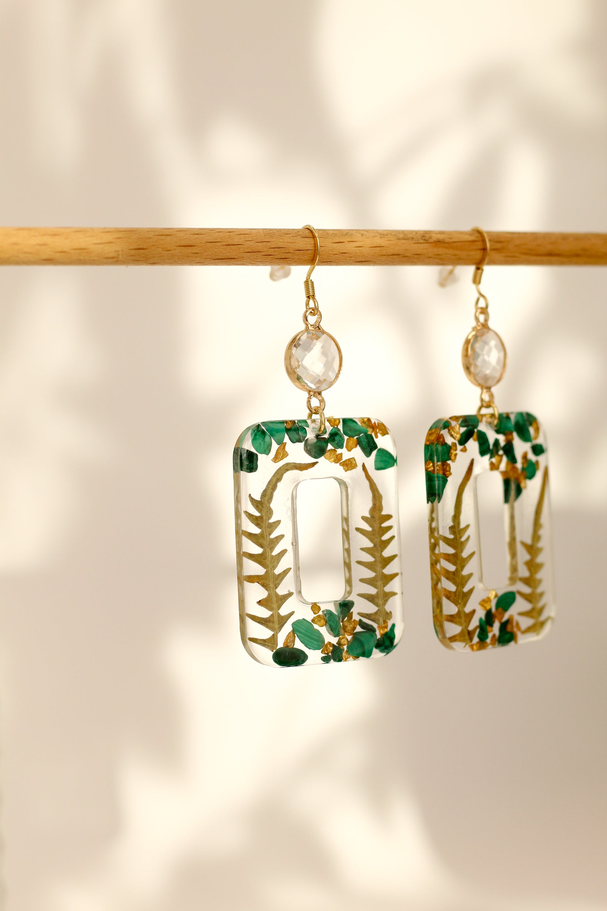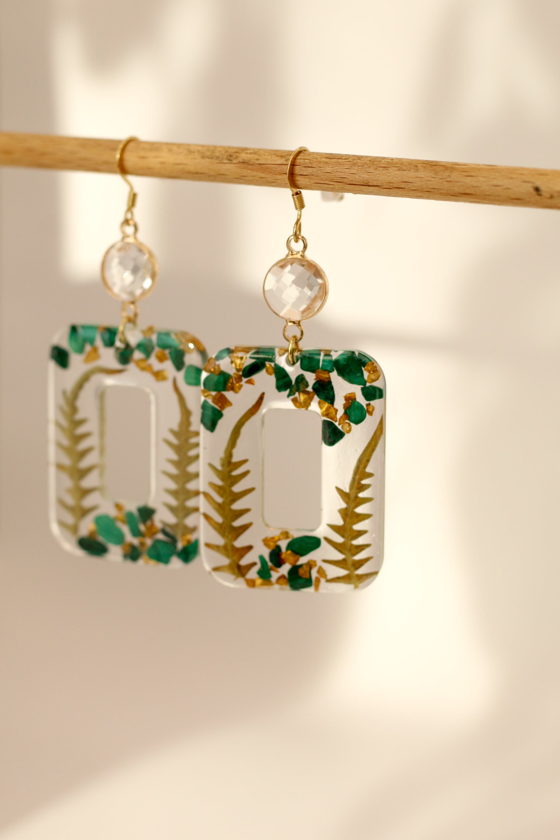 Une paire de boucles d'oreilles fait main en résine, incrustées de véritables fougères cueillies localement, et de malachite au vert intense.