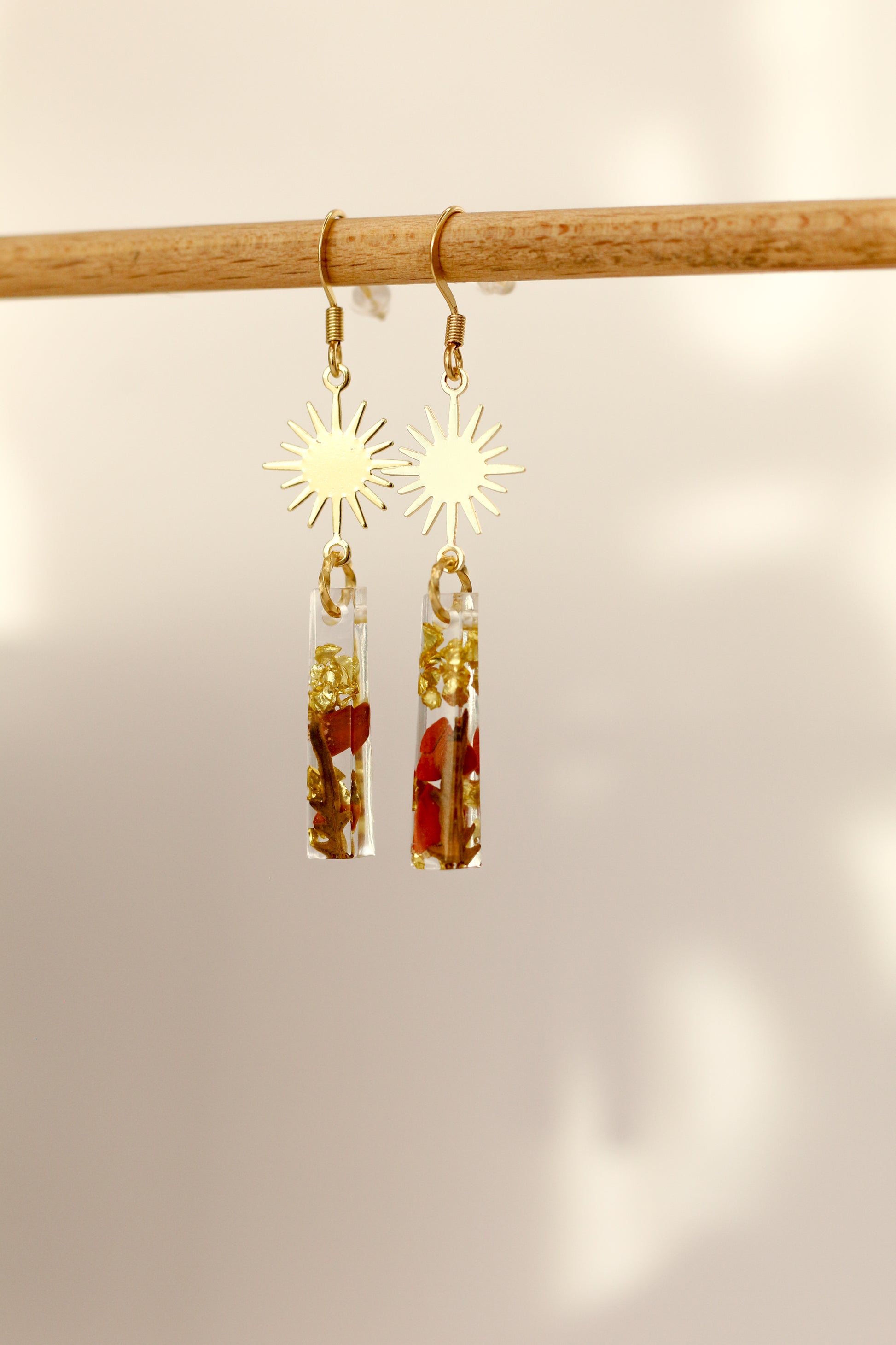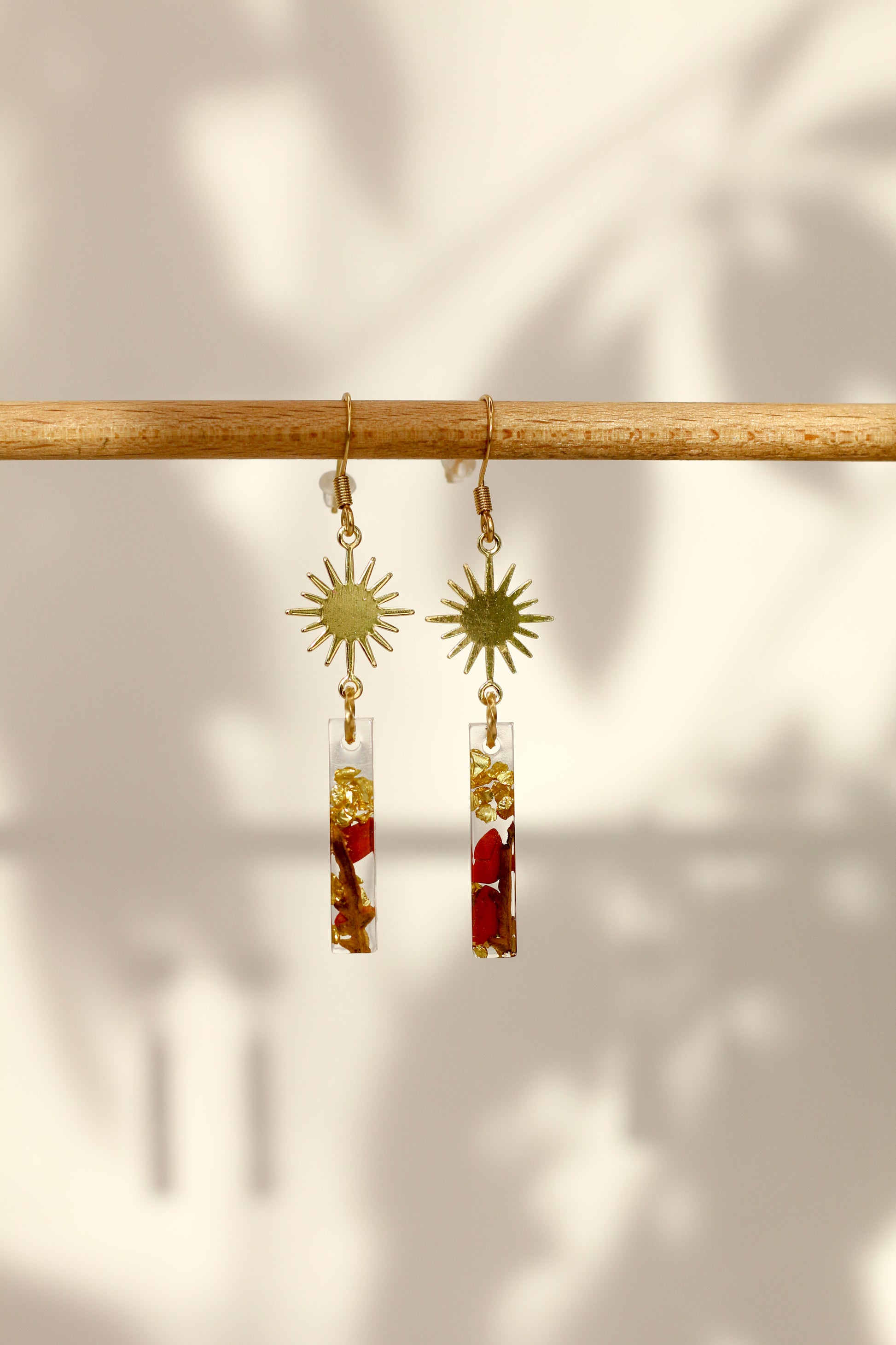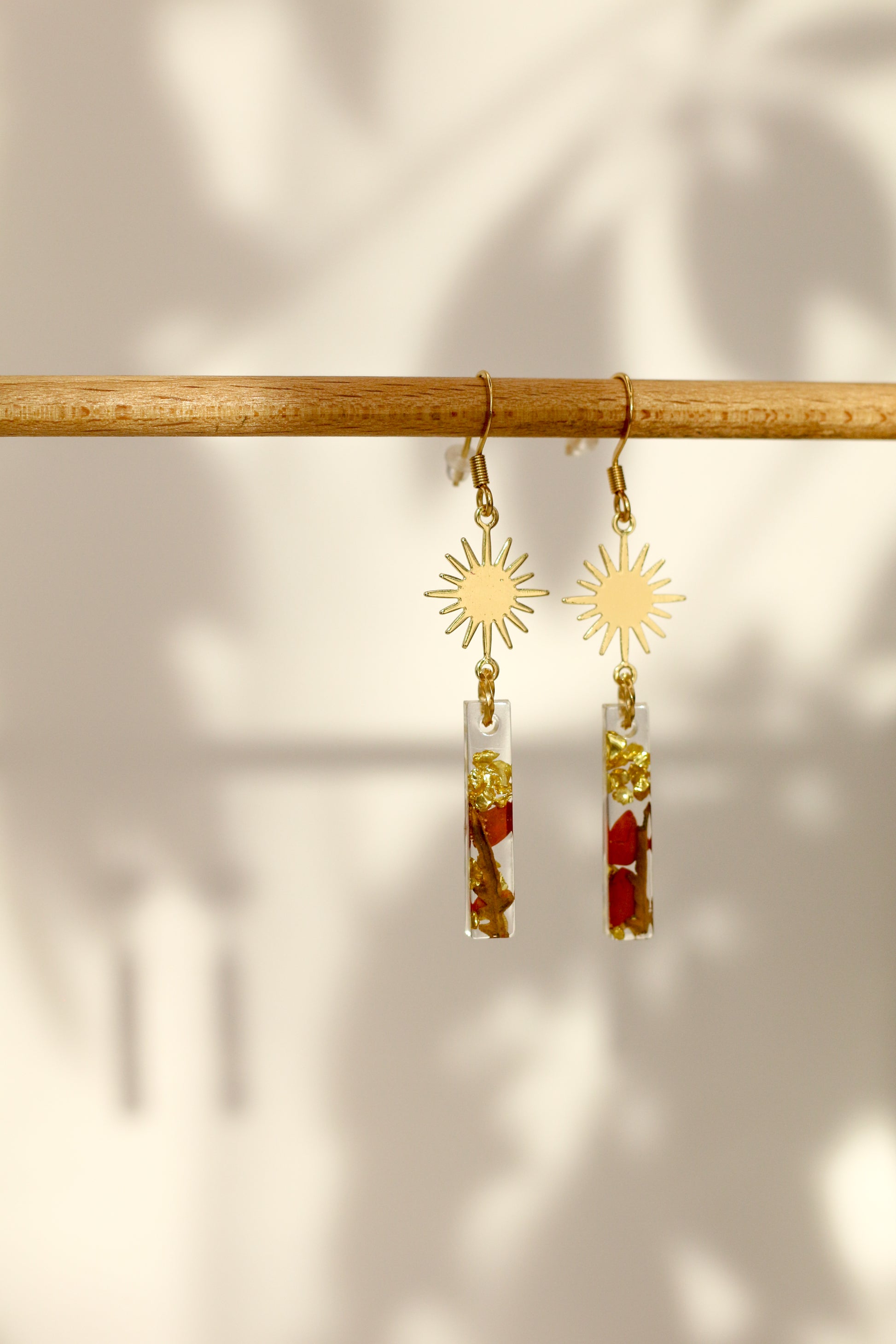 Une paire de boucles d'oreilles qui mélangent des petites fougères récoltées localement à une pierre fine, le jaspe rouge.