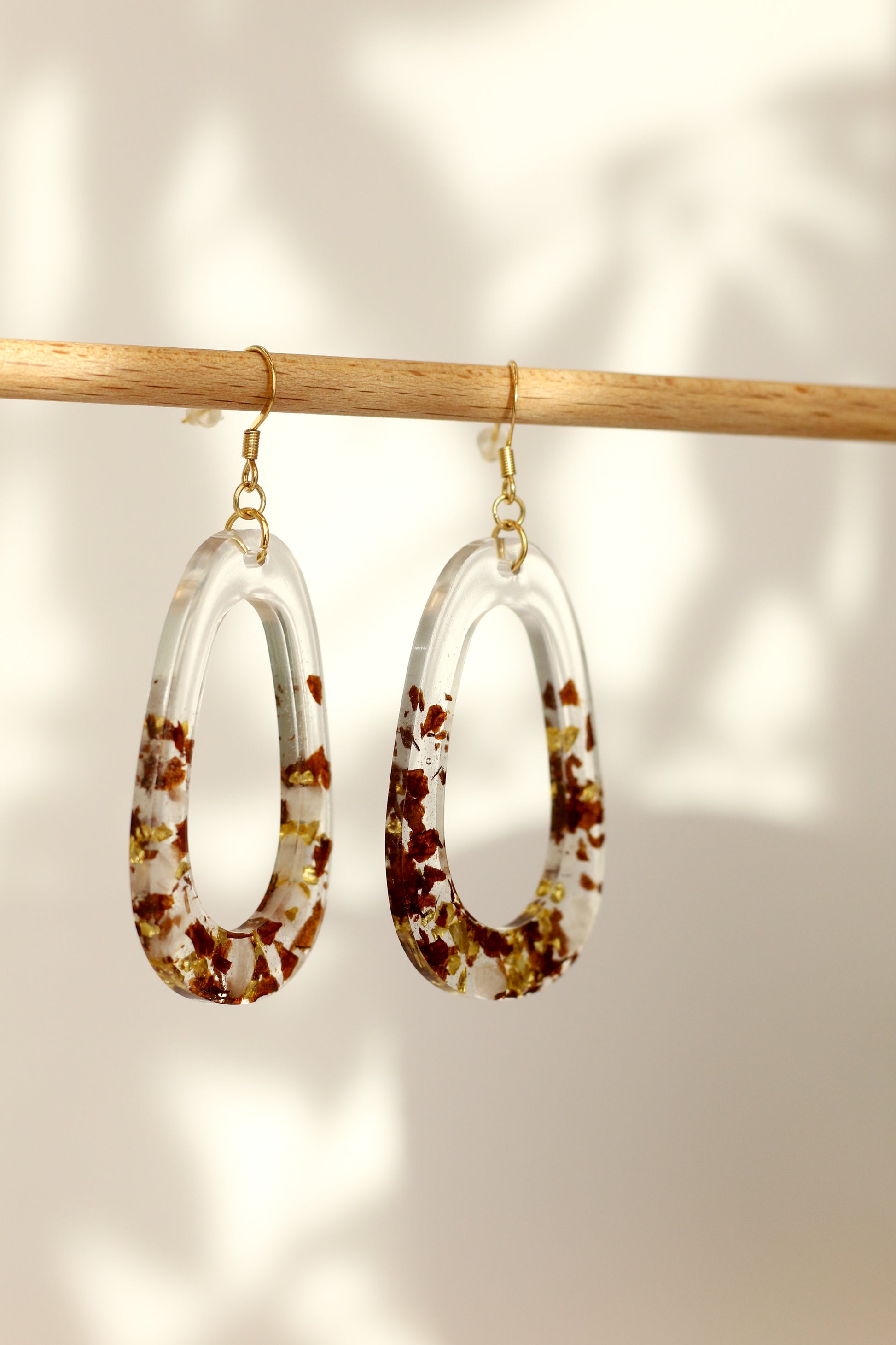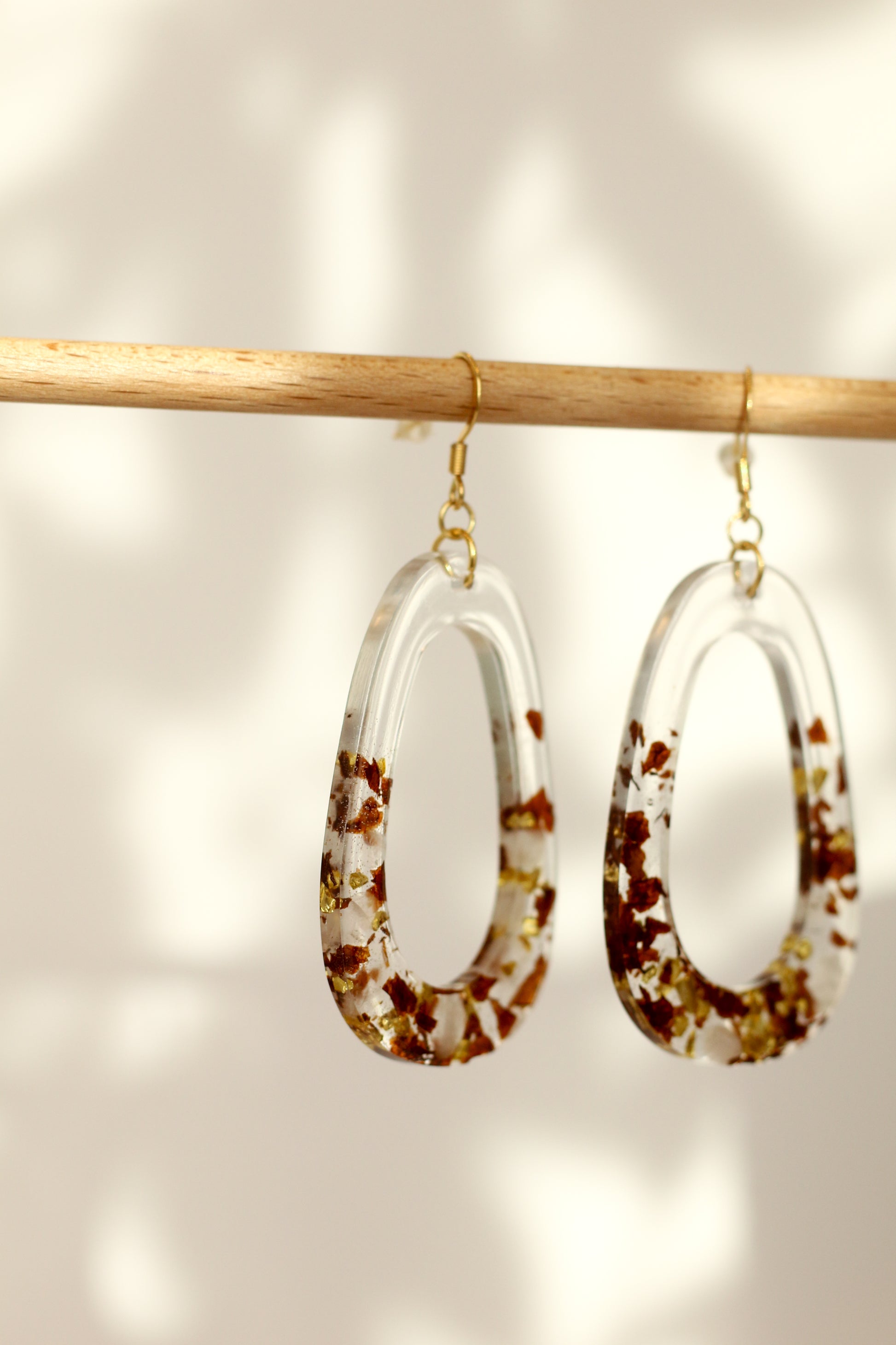 Une paire de boucles d'oreilles fait main en résine, incrustées de pétales de roses fragmentés et de quartz rose.