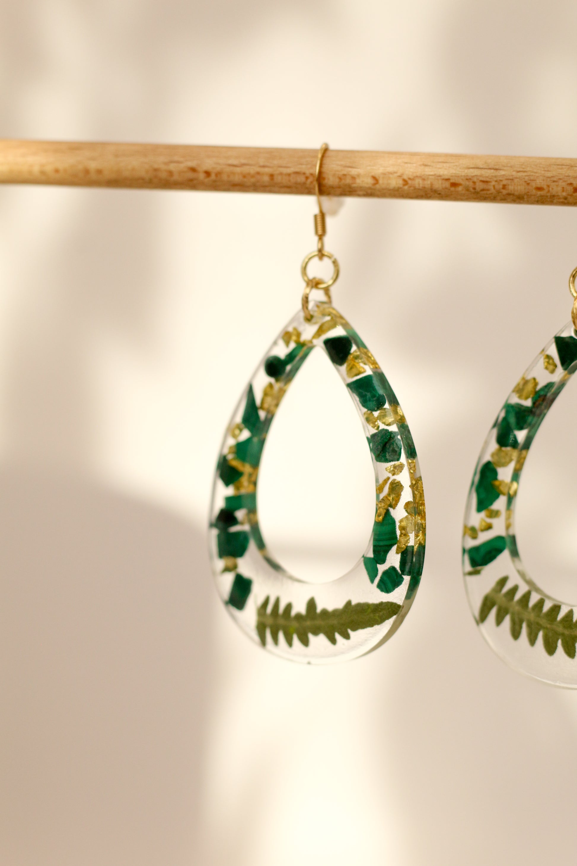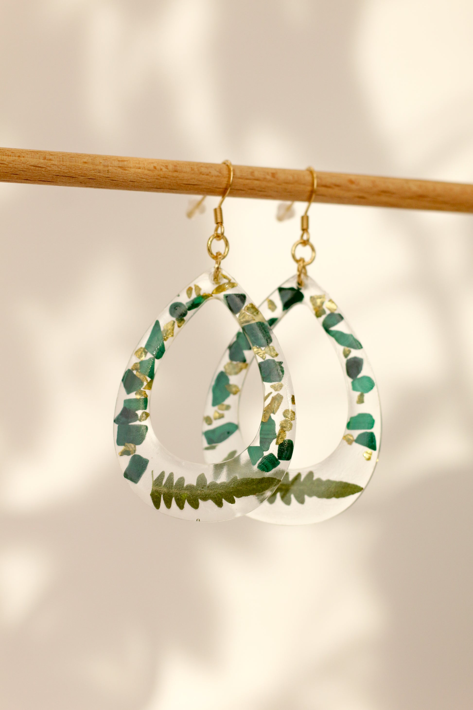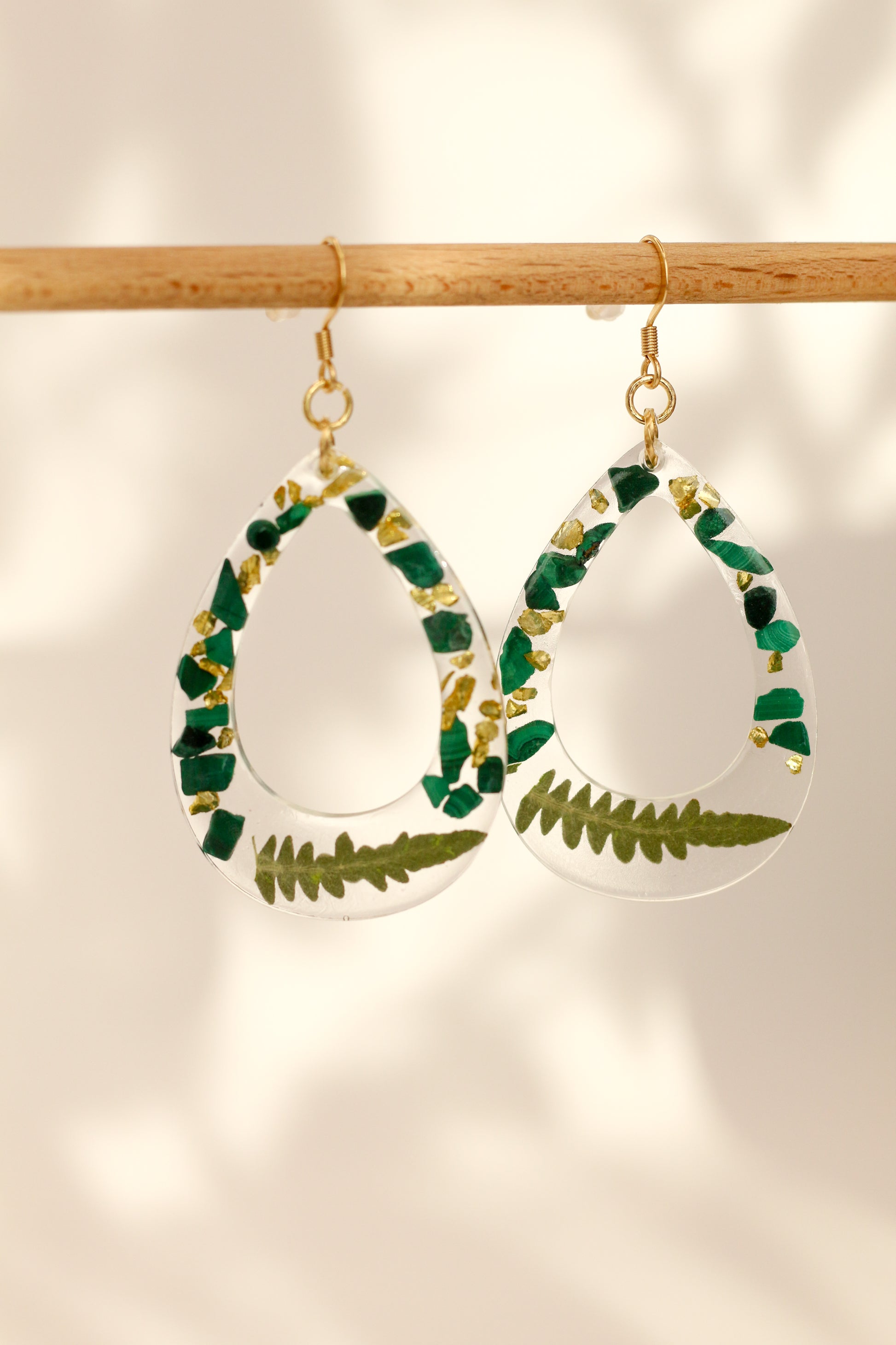 Une paire de boucles d'oreilles fait main en résine, incrustées de véritables fougères cueillies localement, et de malachite au vert intense.