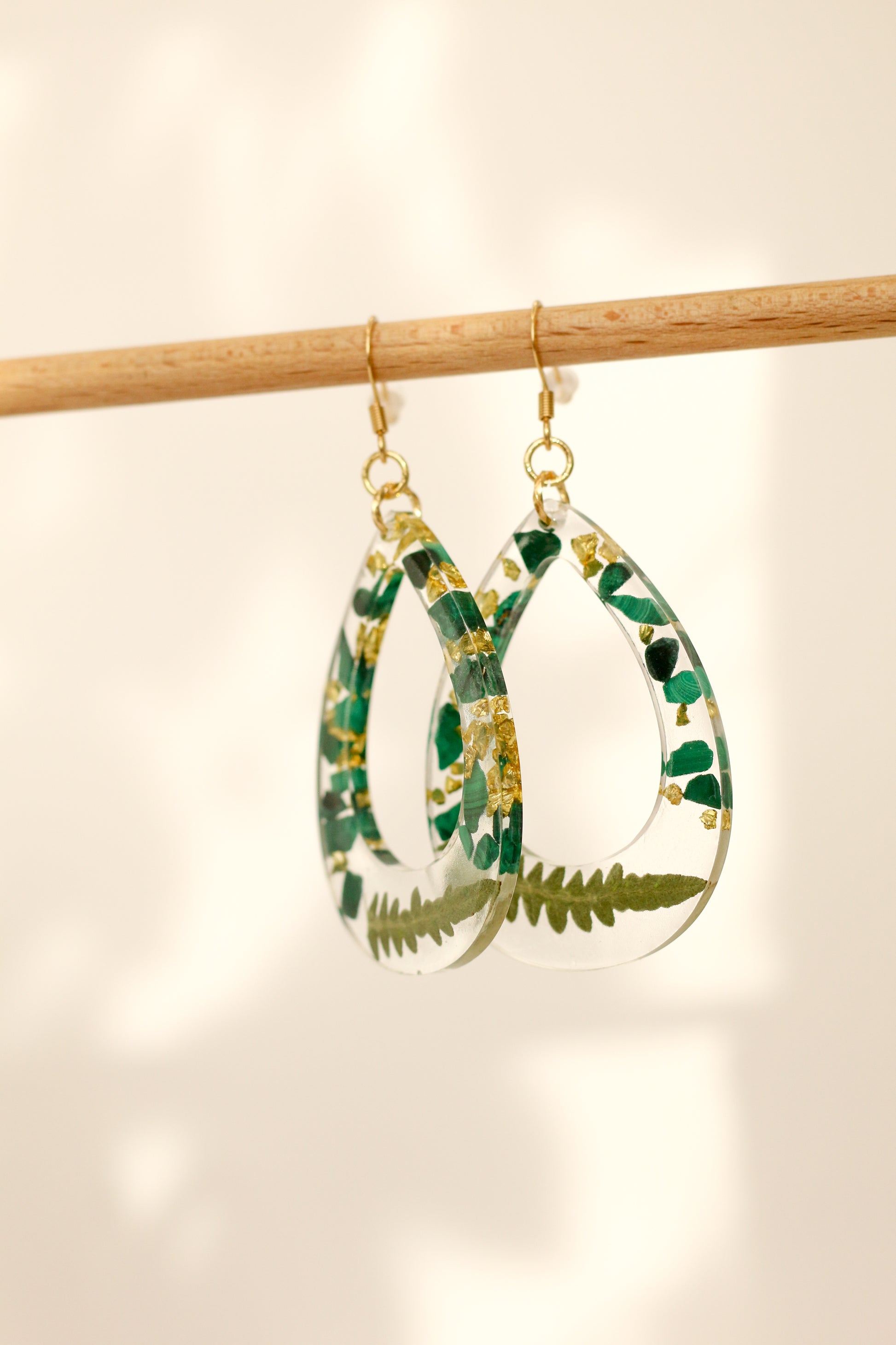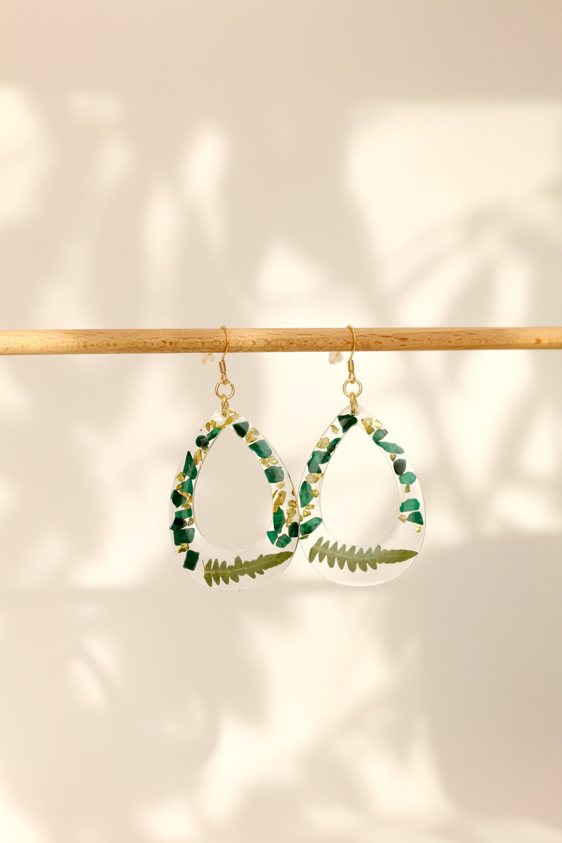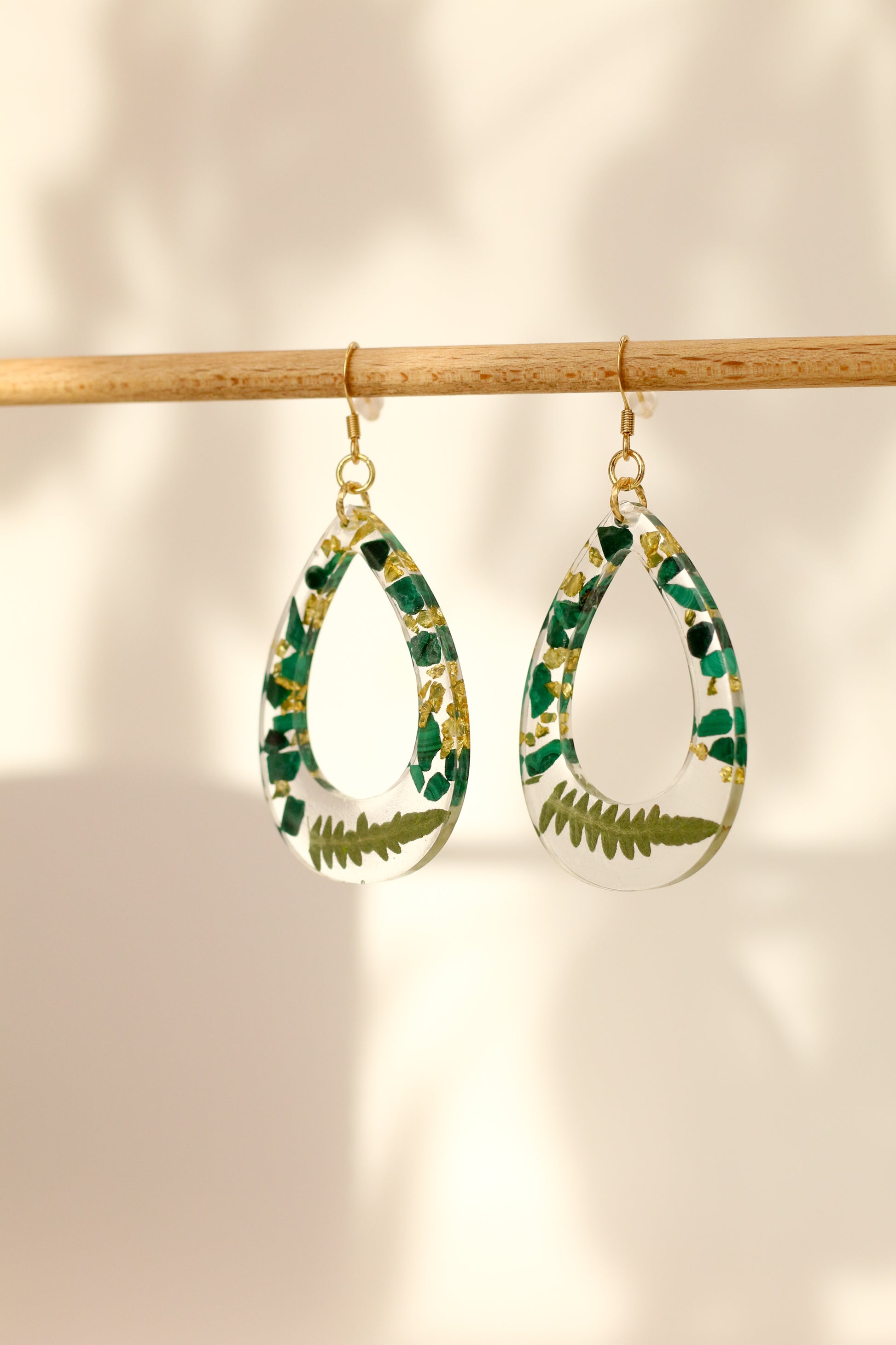 Une paire de boucles d'oreilles fait main en résine, incrustées de véritables fougères cueillies localement, et de malachite au vert intense.