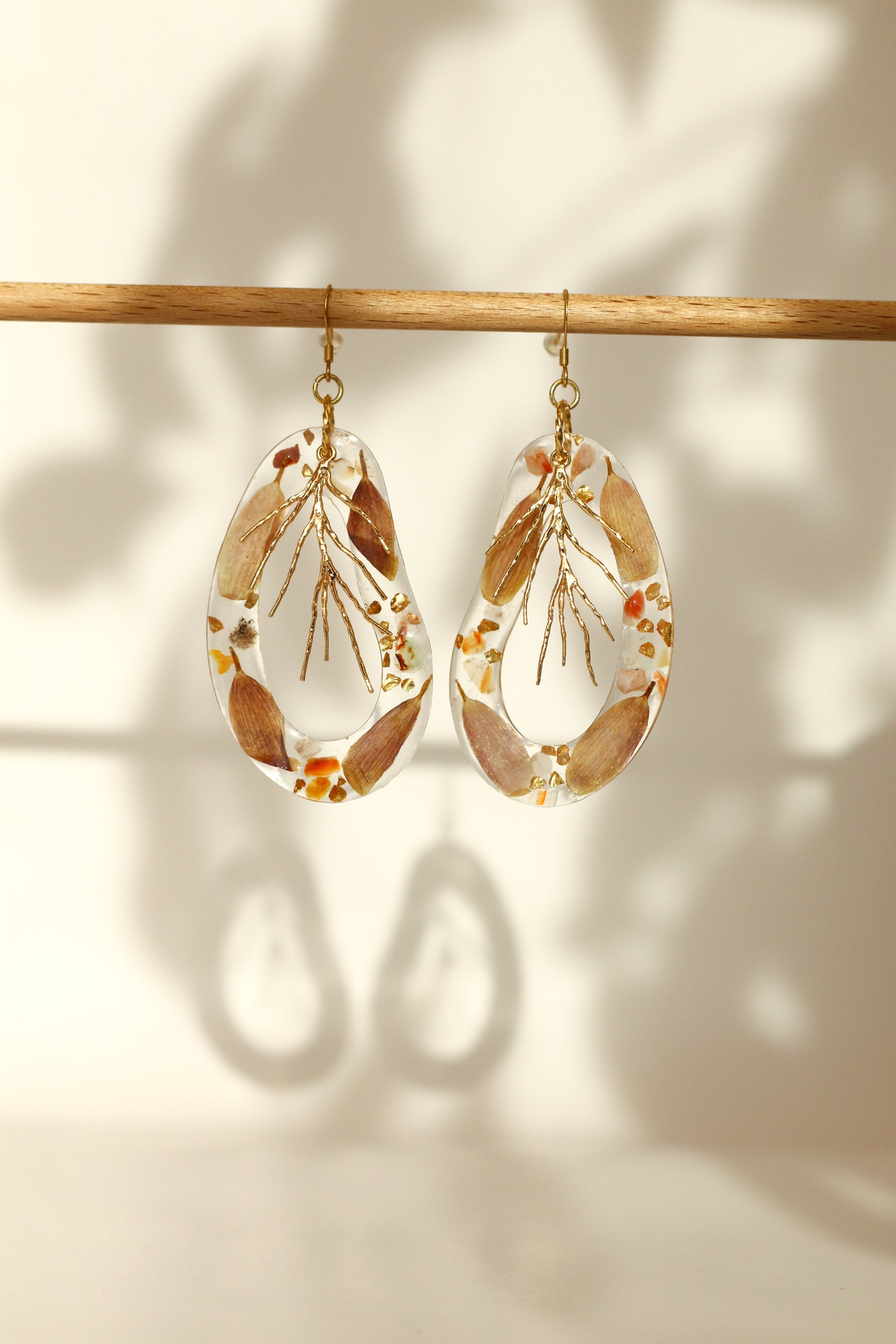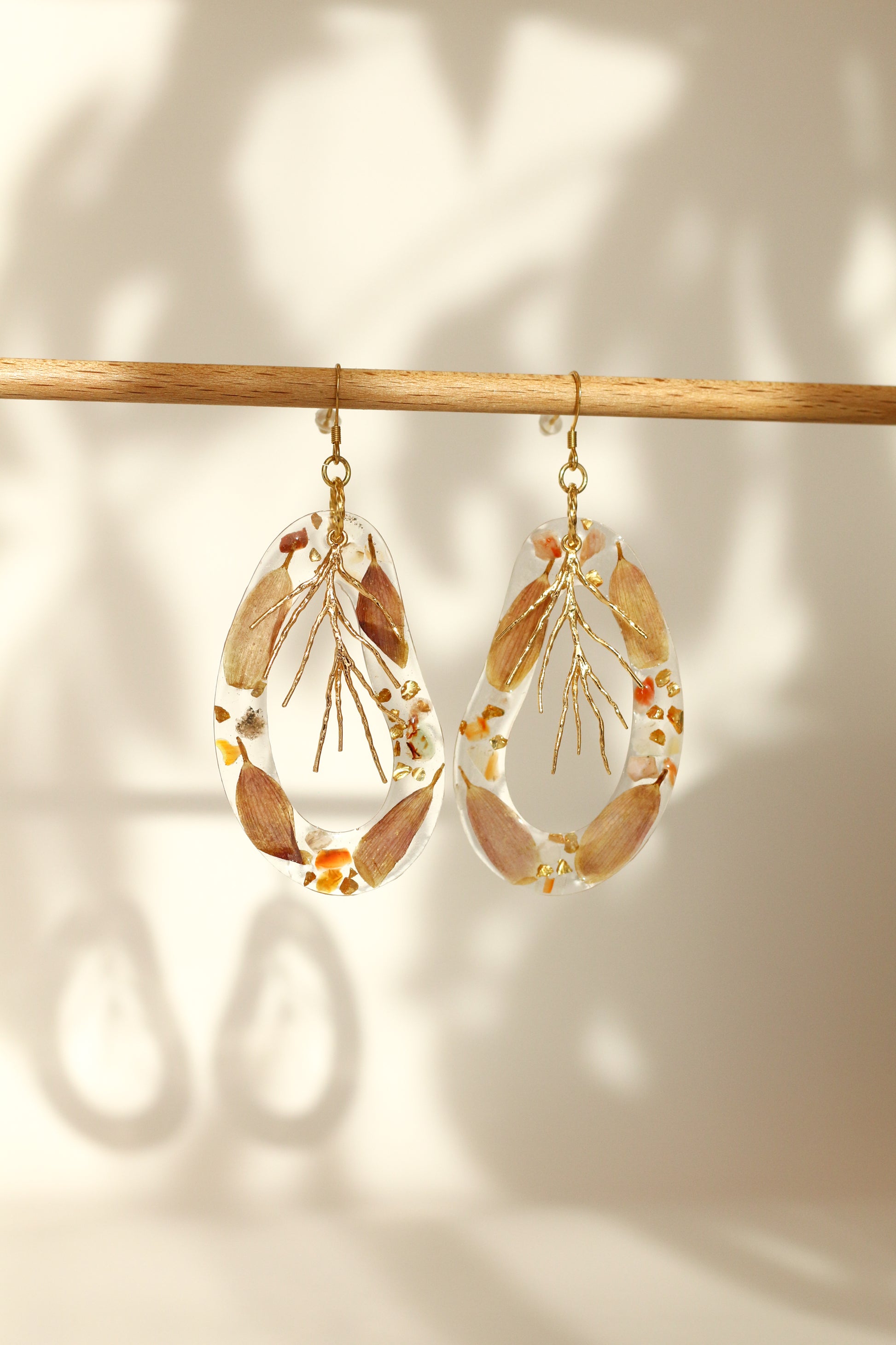 Une paire de boucles d'oreilles fait main en résine, incrustées de véritable pétales de fleurs récoltées localement et de cornaline.