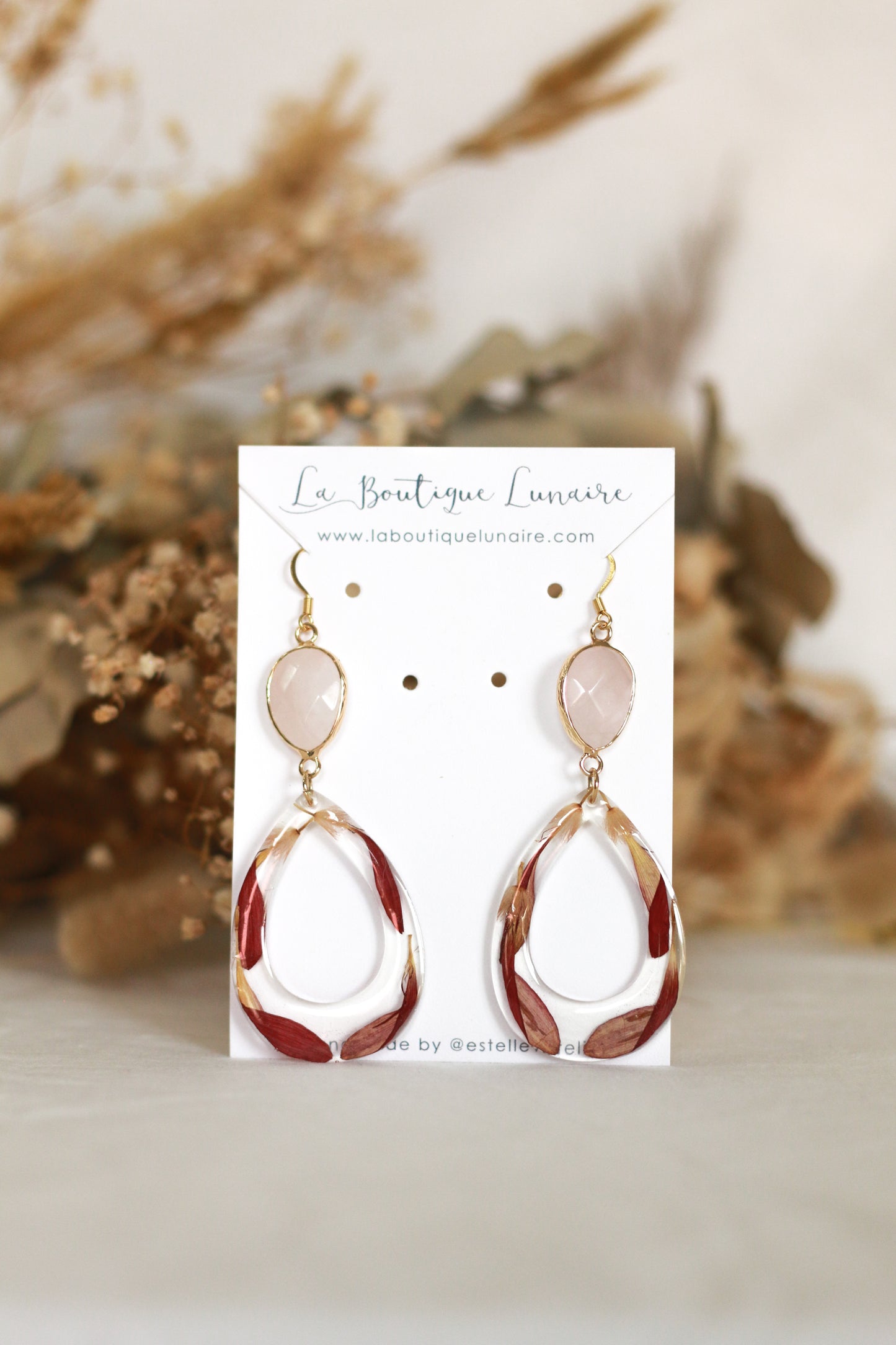 • Une paire de boucles d'oreilles en résine époxy, incrustée de pétales de fleurs et surmontée de quartz rose
