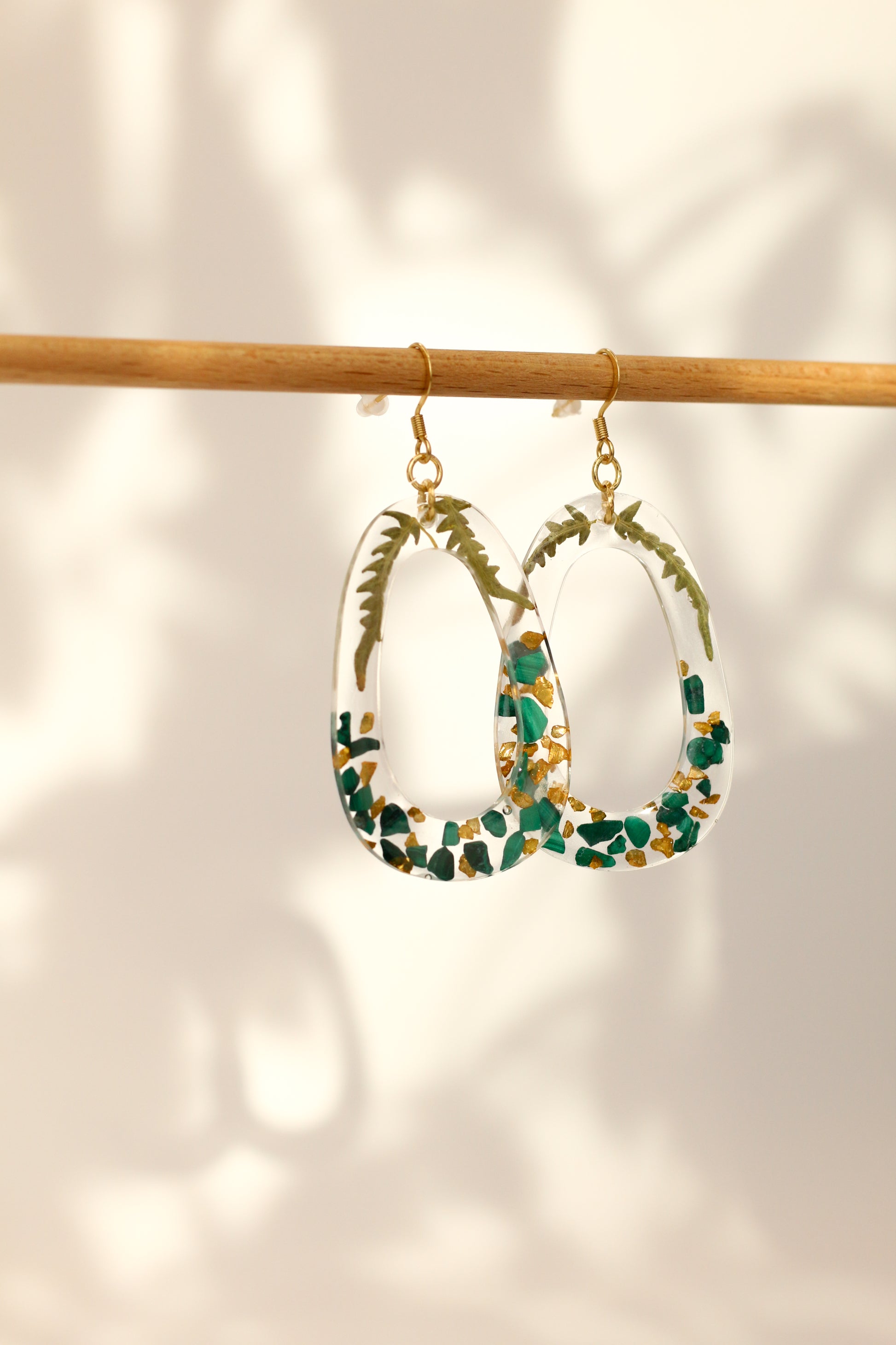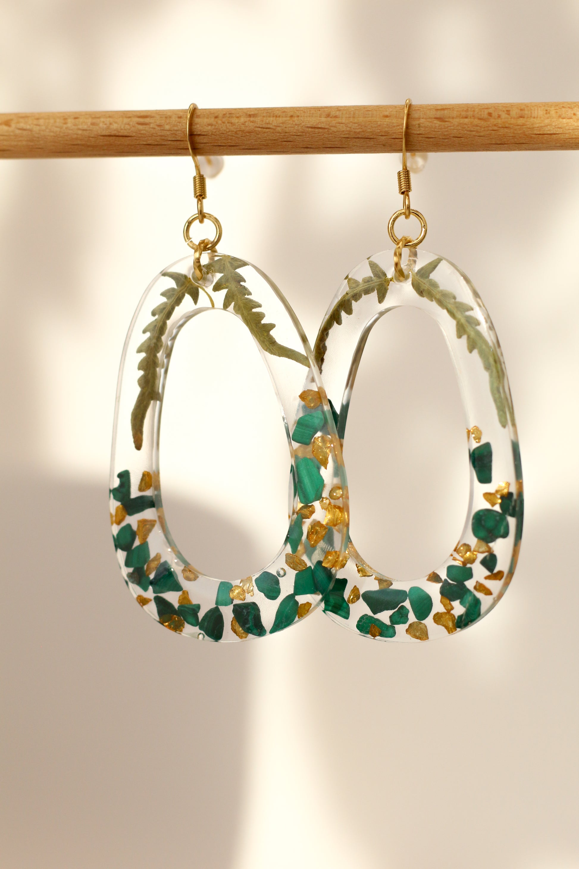 Une paire de boucles d'oreilles fait main en résine, incrustées de véritables fougères cueillies localement, et de malachite au vert intense.