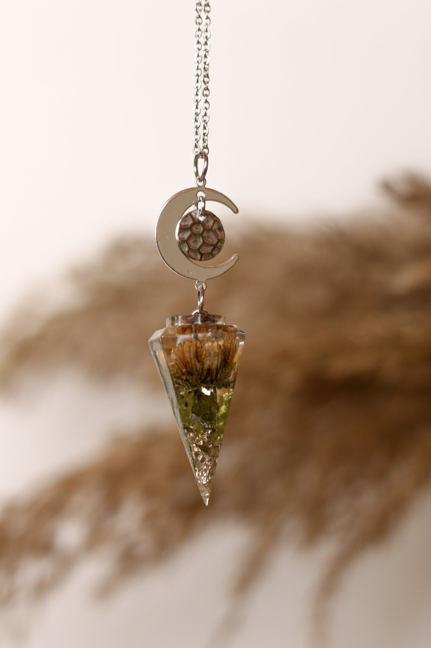 • Pendule en résine incrusté d'une fleur entière, de fragments de péridot et de copeaux décoratifs argentés.