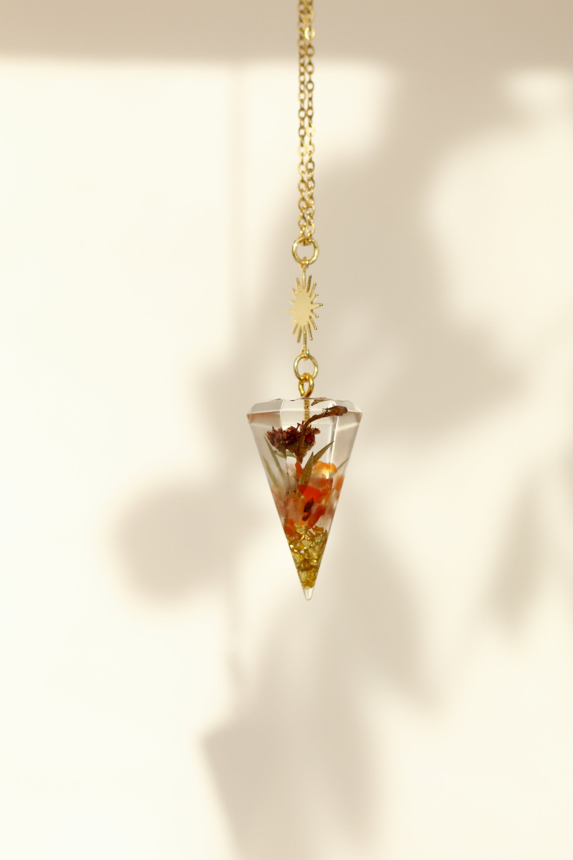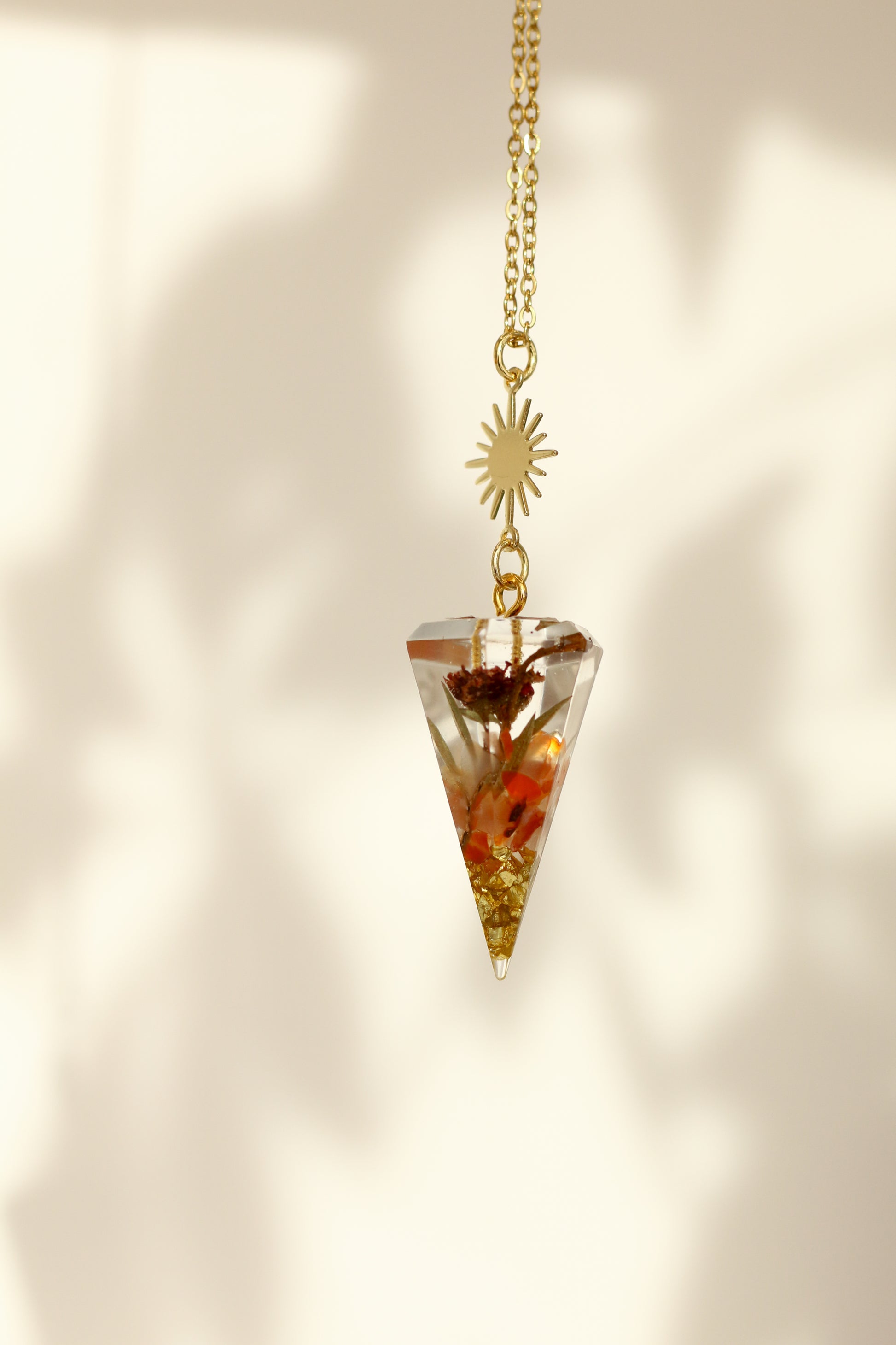 Un pendule unique, fait main en résine, incrusté d'une véritable fleur et de pierre fine, la cornaline.