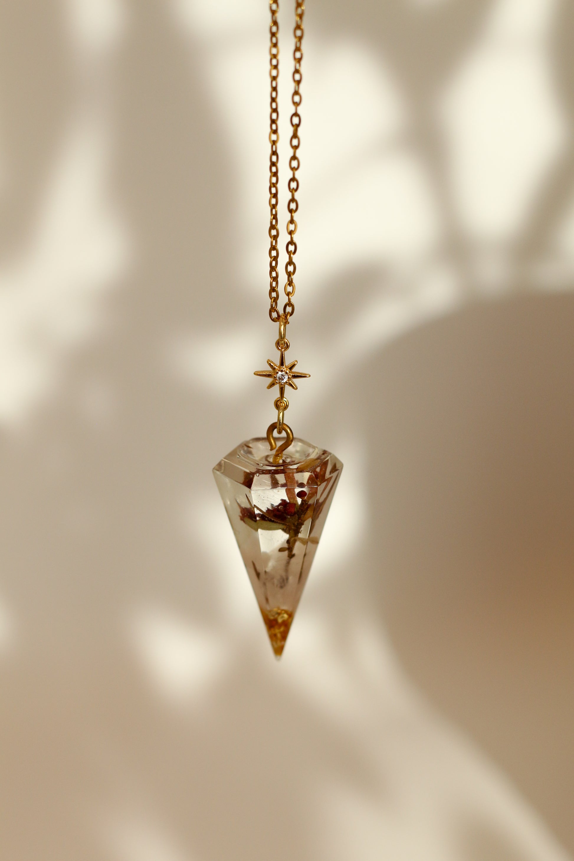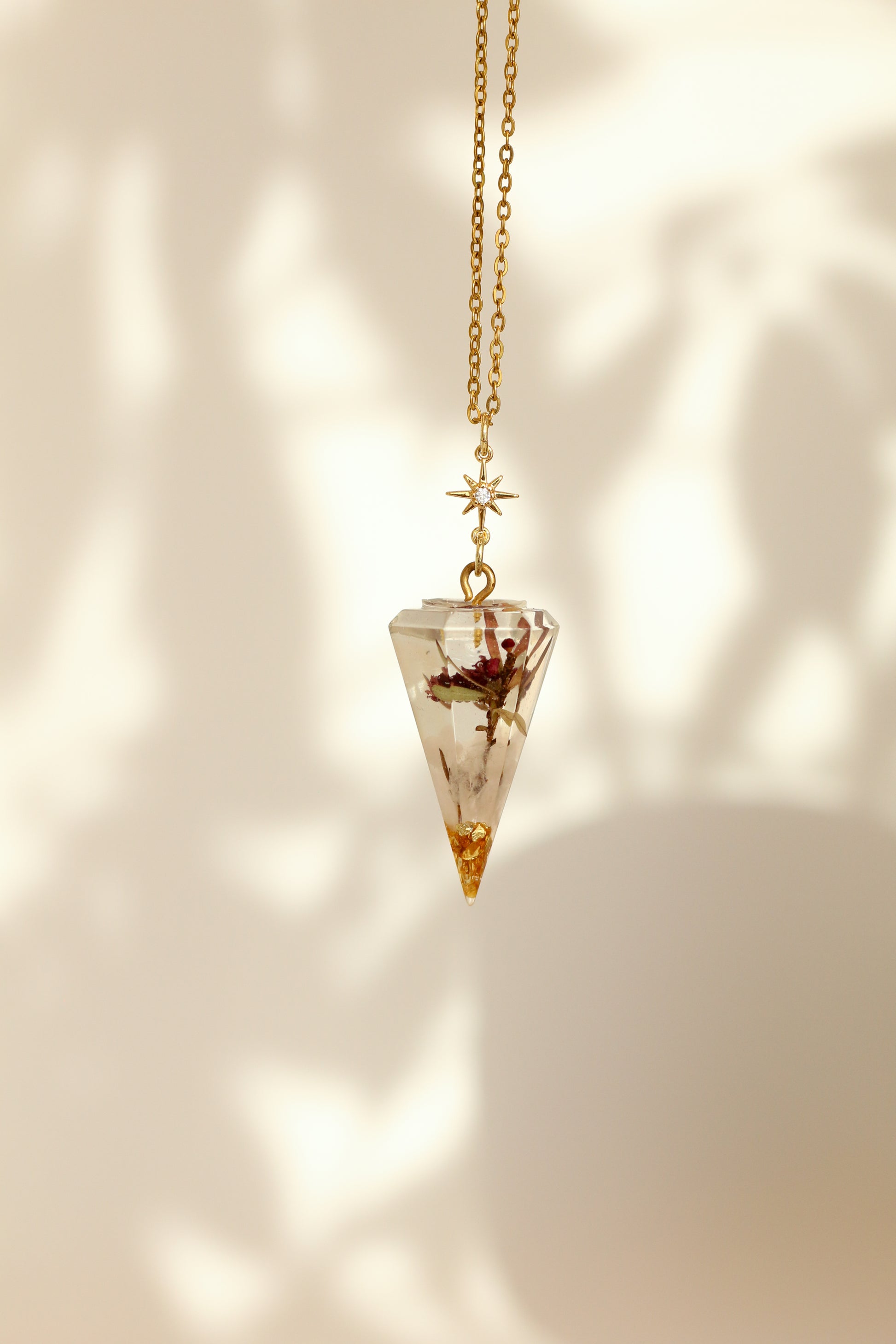 Un pendule unique, fait main en résine, incrusté d'une véritable fleur et de pierre fine, le quartz rose.