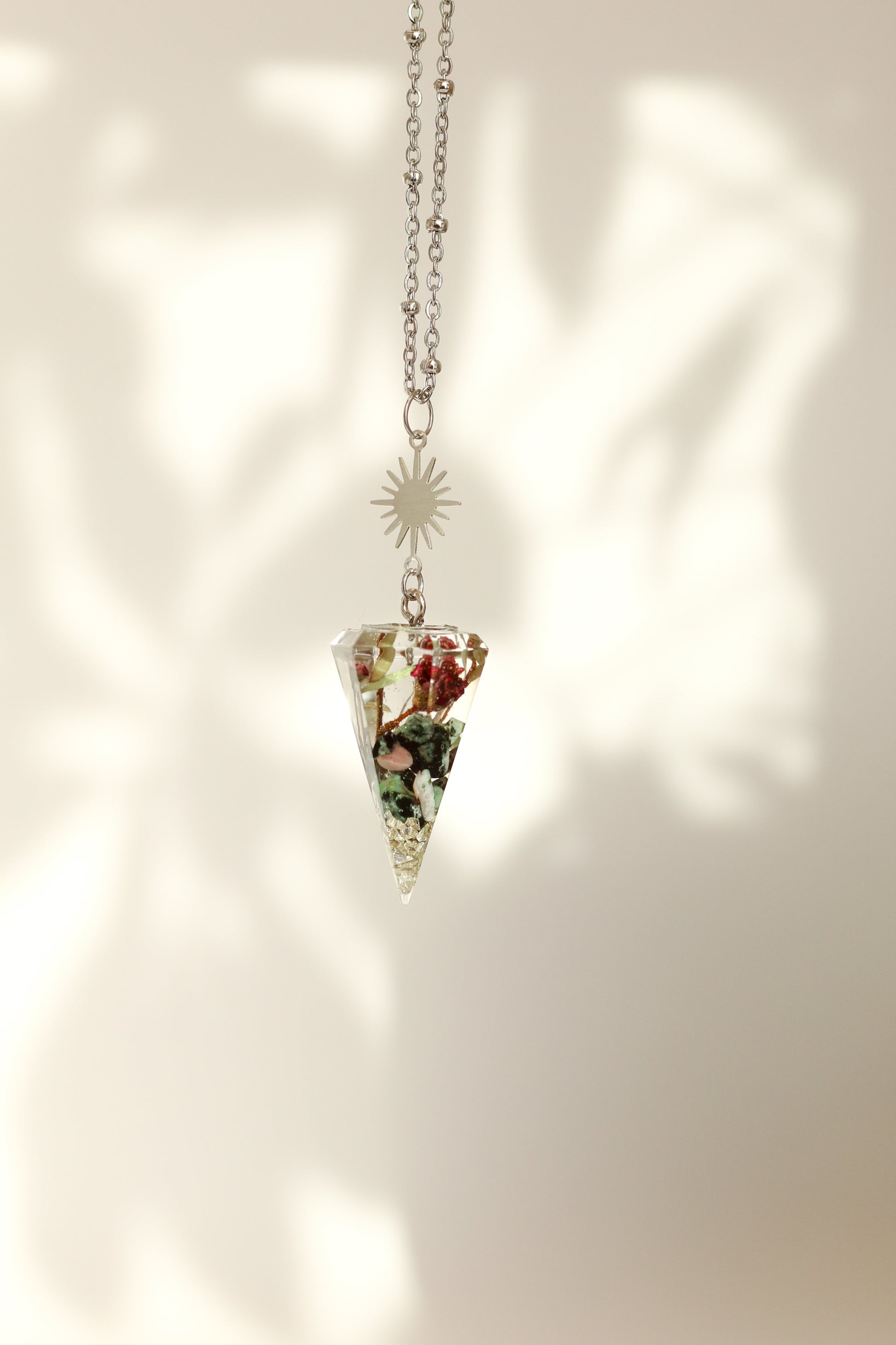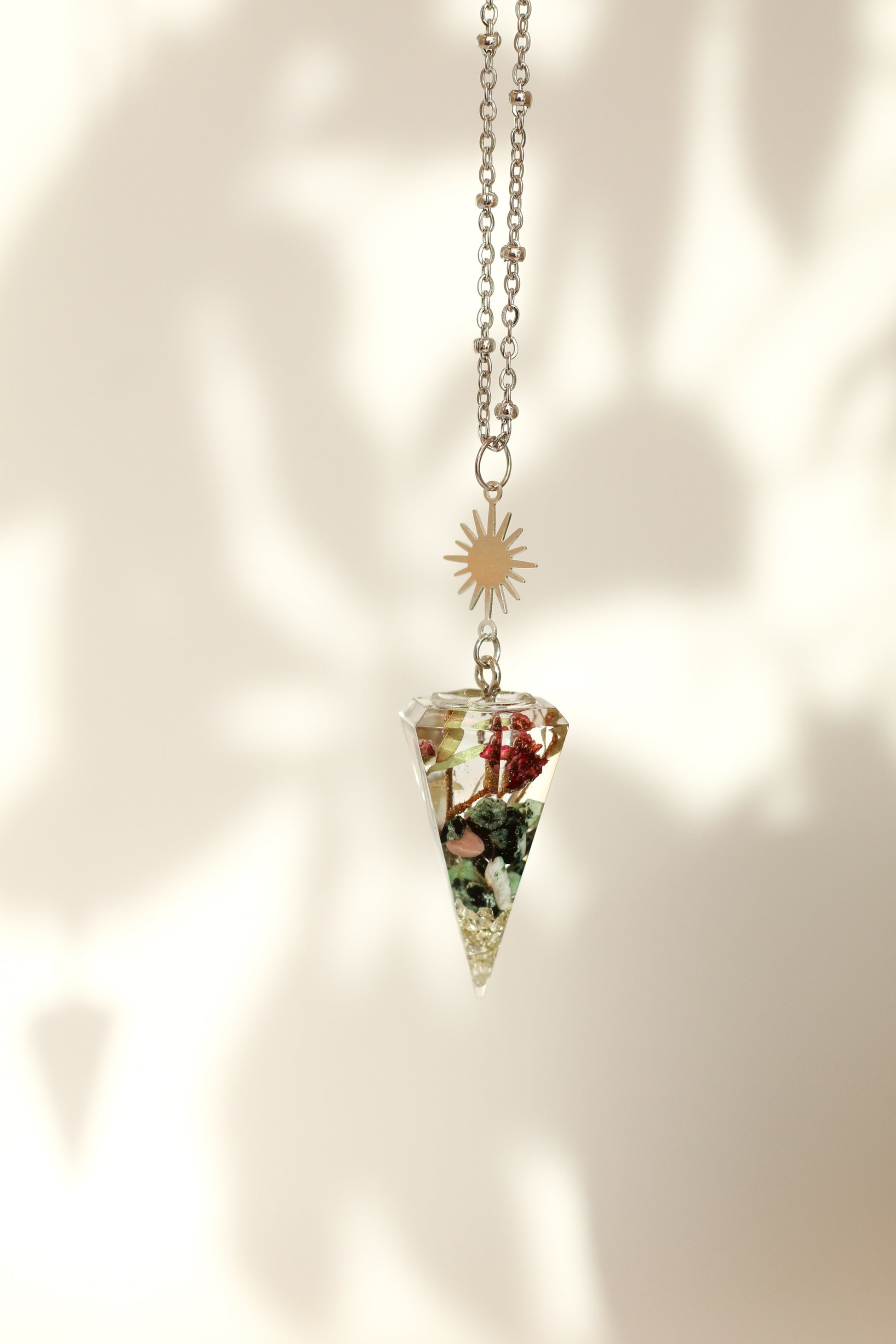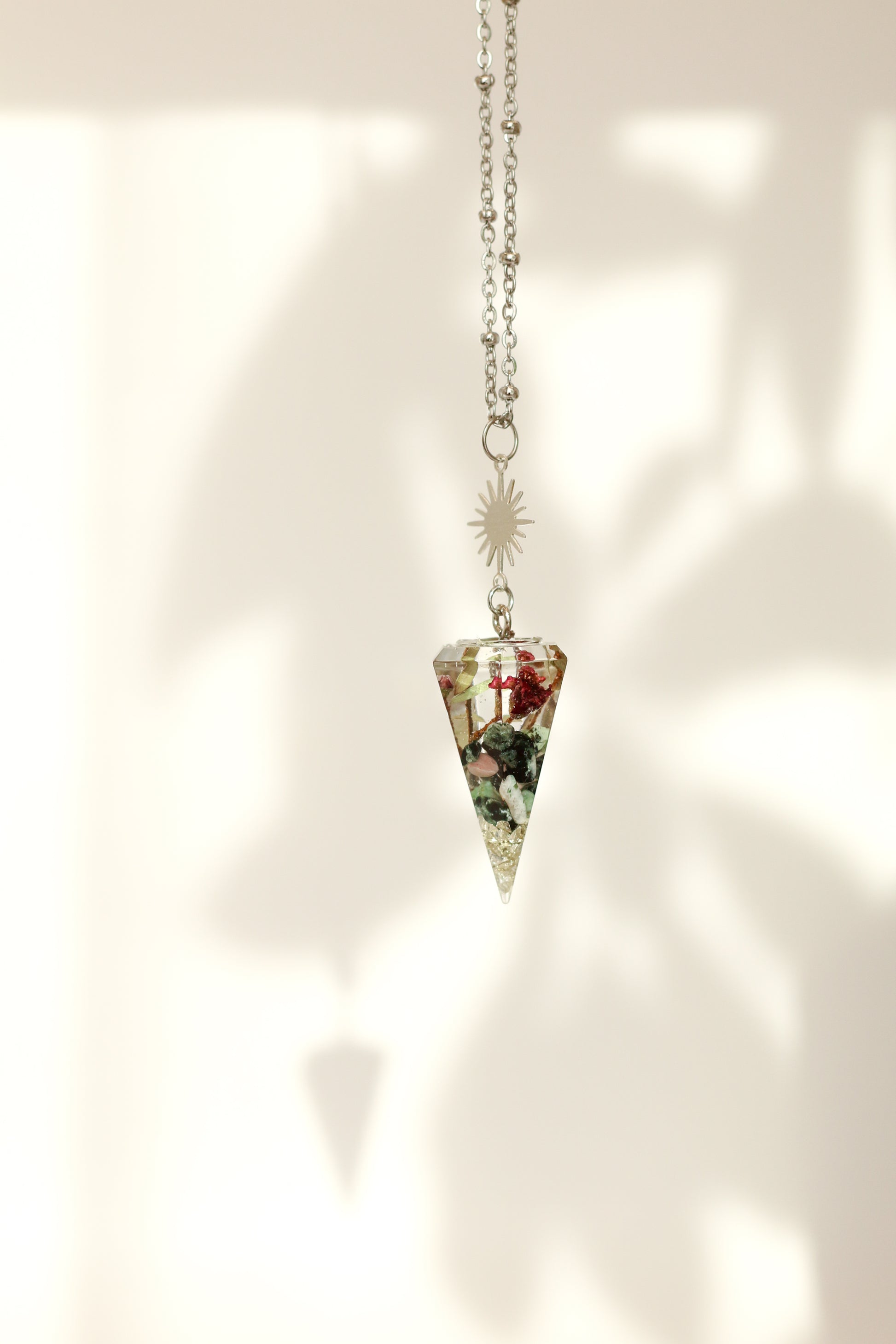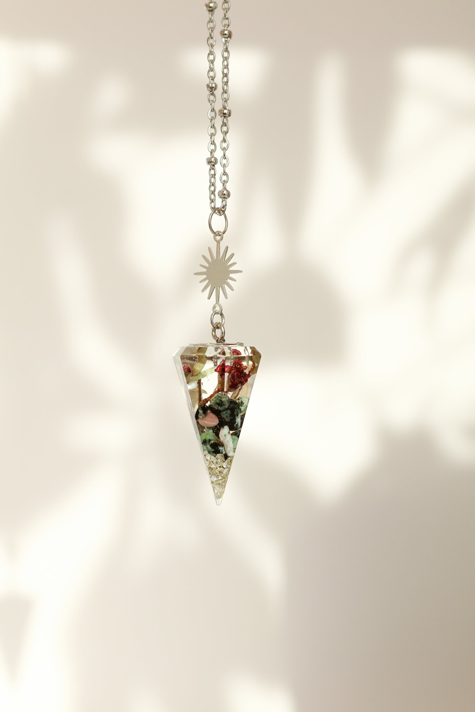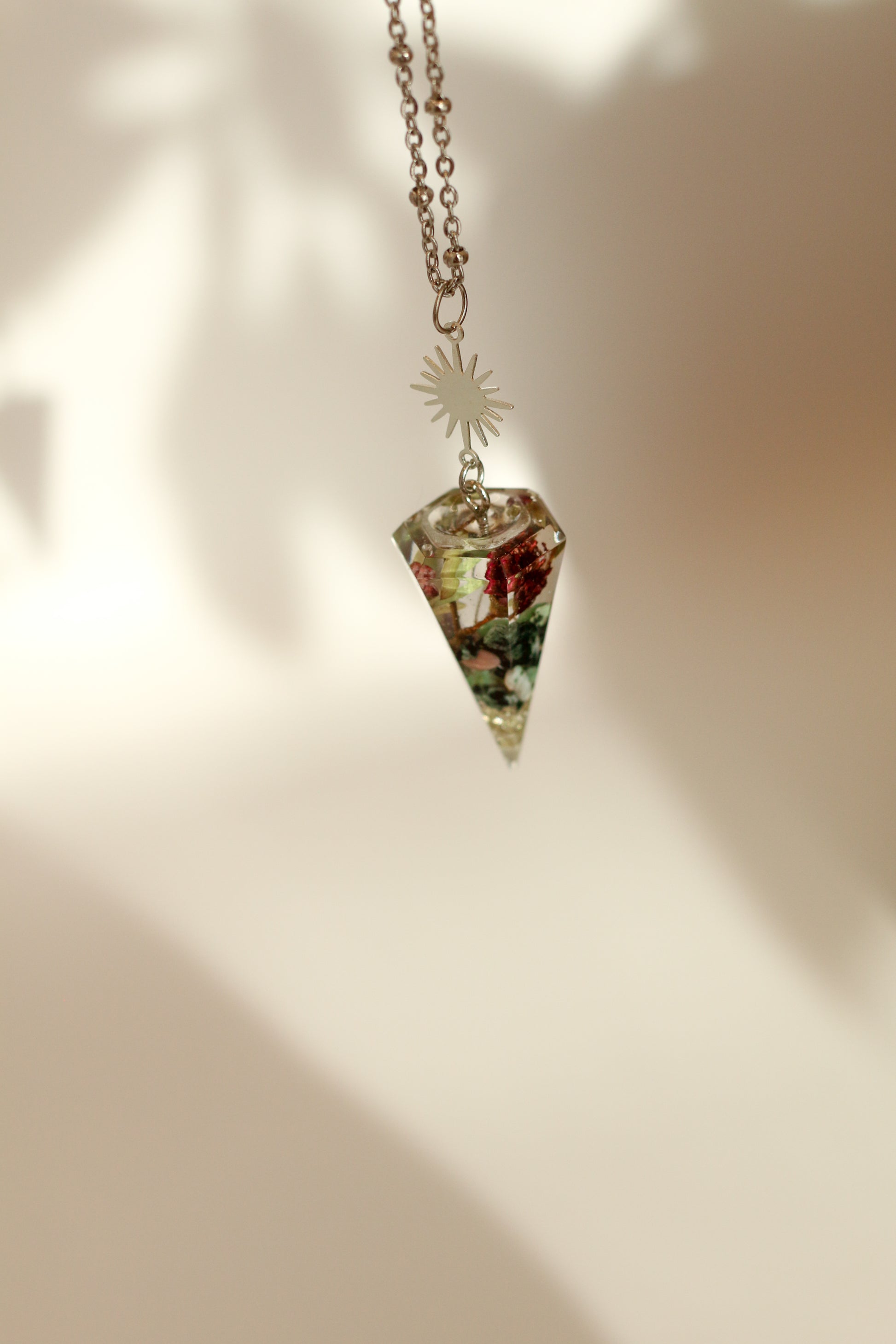 Un pendule unique, fait main en résine, incrusté d'une véritable fleur et de pierre fine, l'épidote.