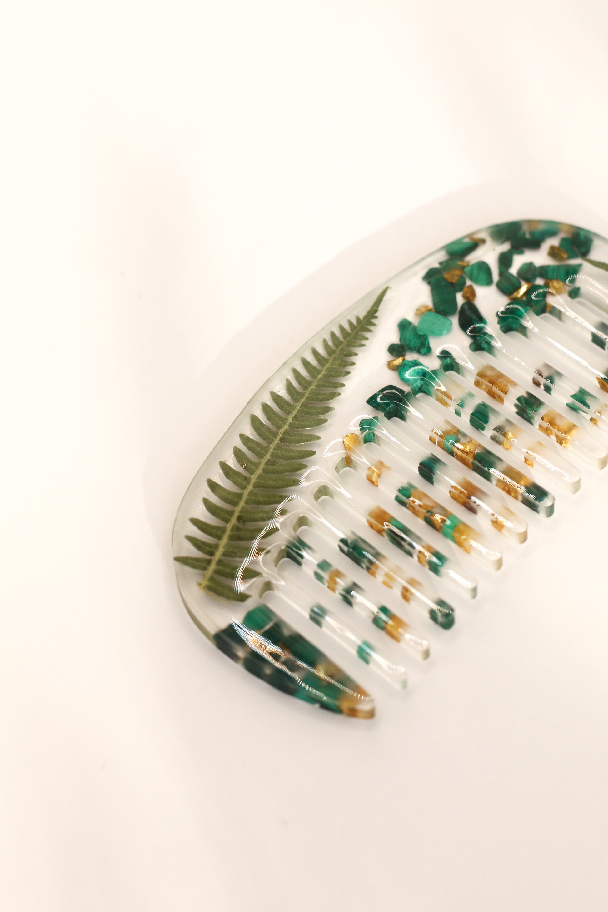 • Peigne fait main en résine, incrusté de fougères et de malachite