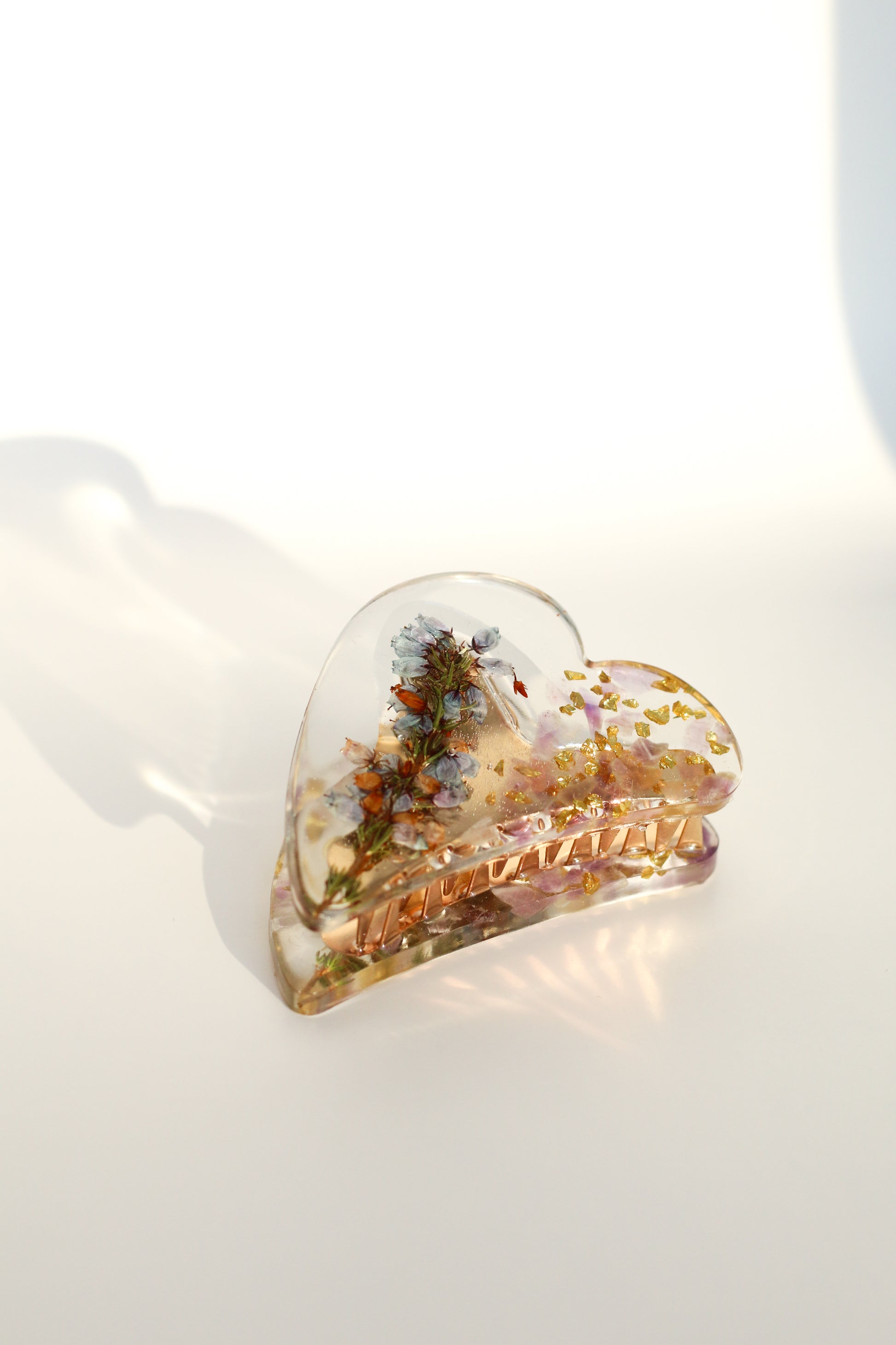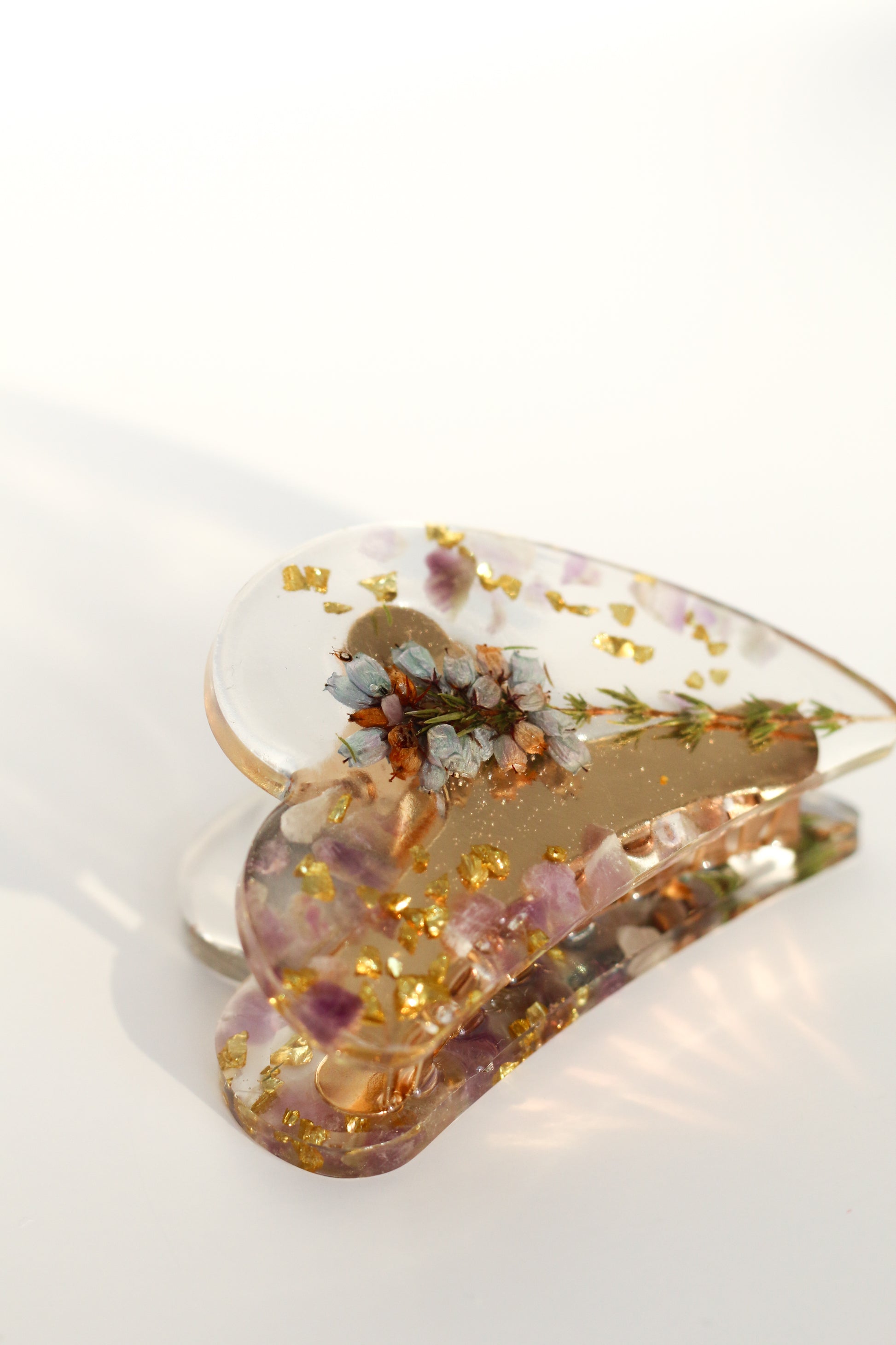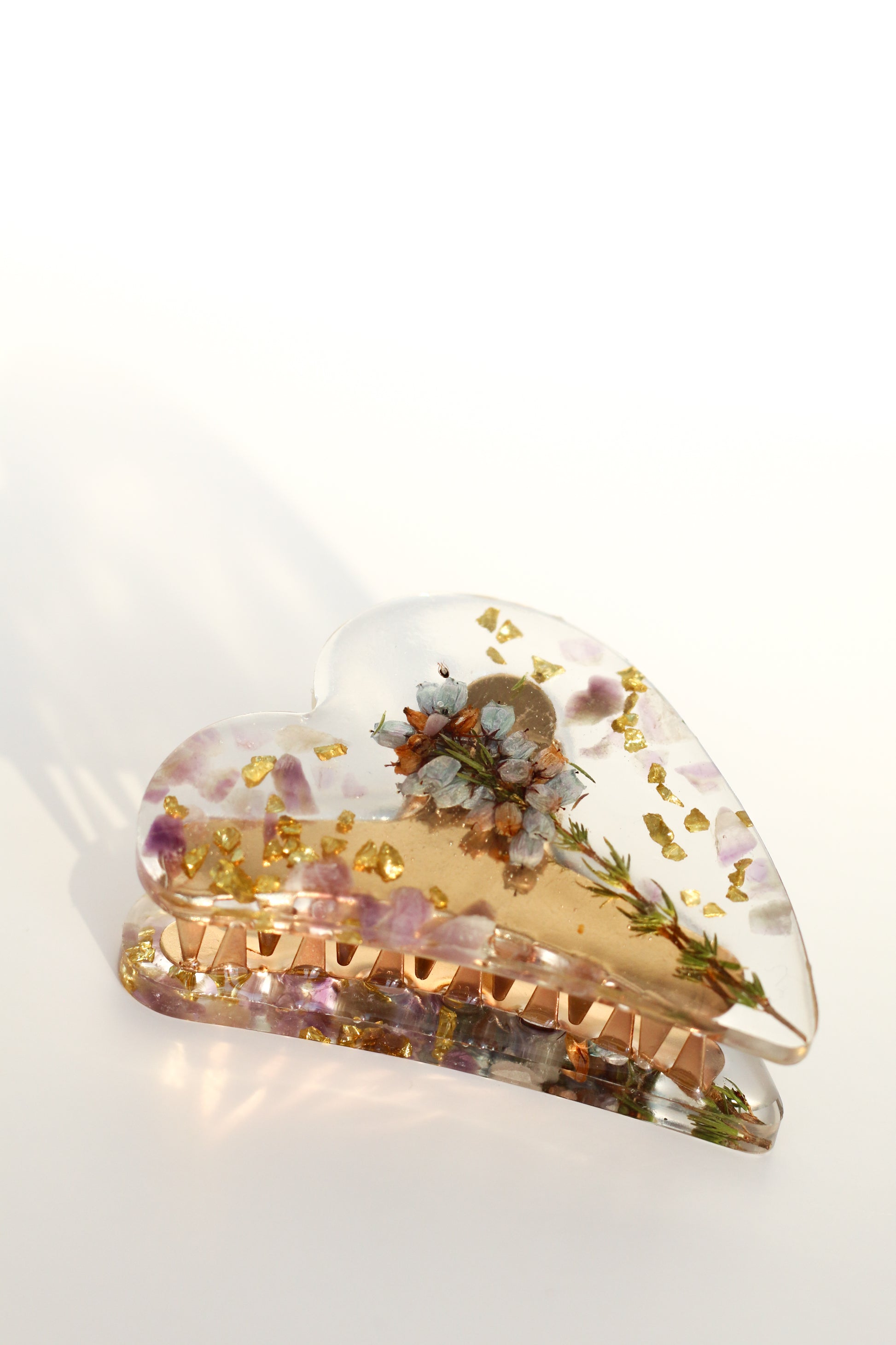 Pince à cheveux incrustée de bruyères cueillies localement, et d'une pierre fine violette, l’améthyste. Un accessoire à cheveux original, proche du bijoux.