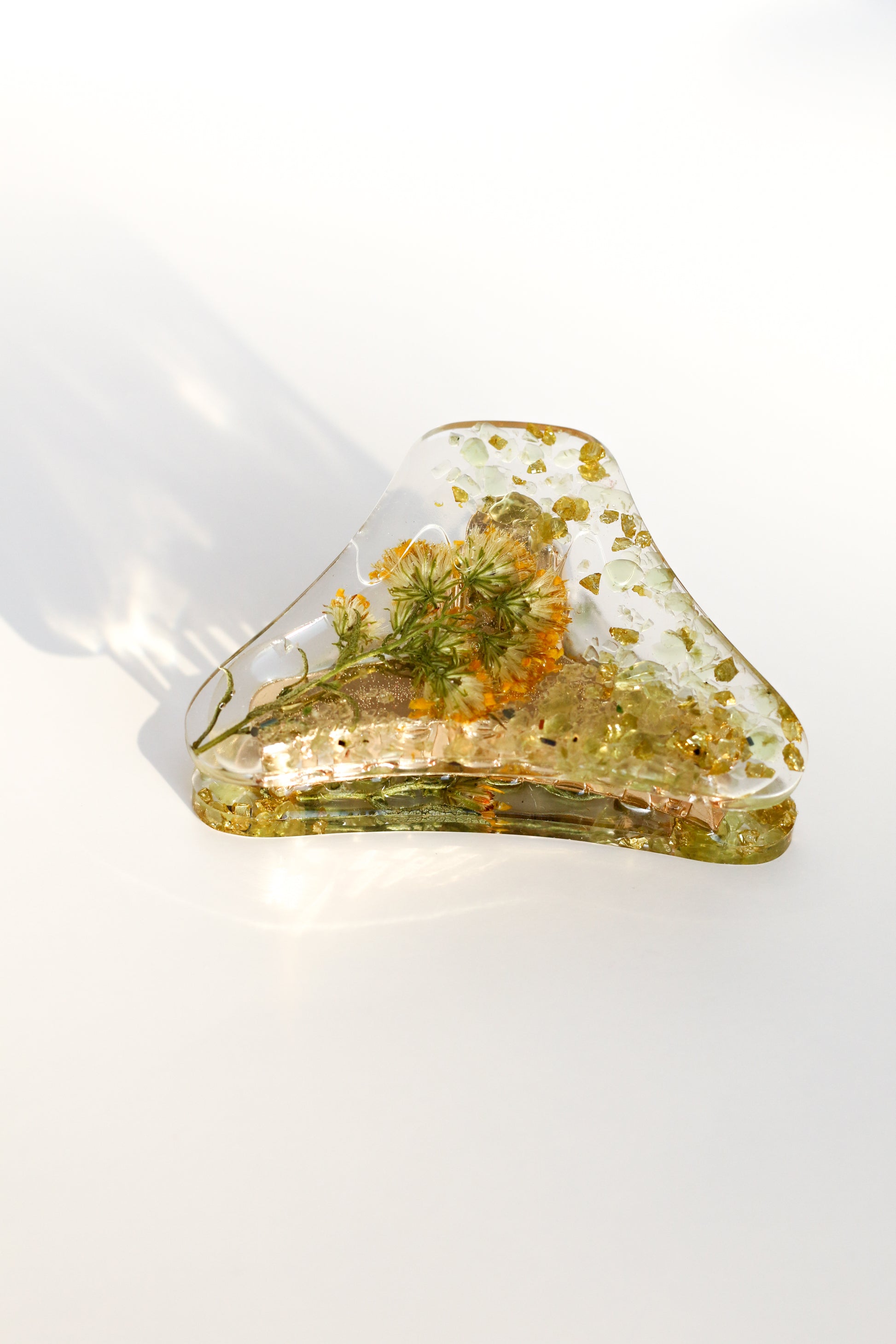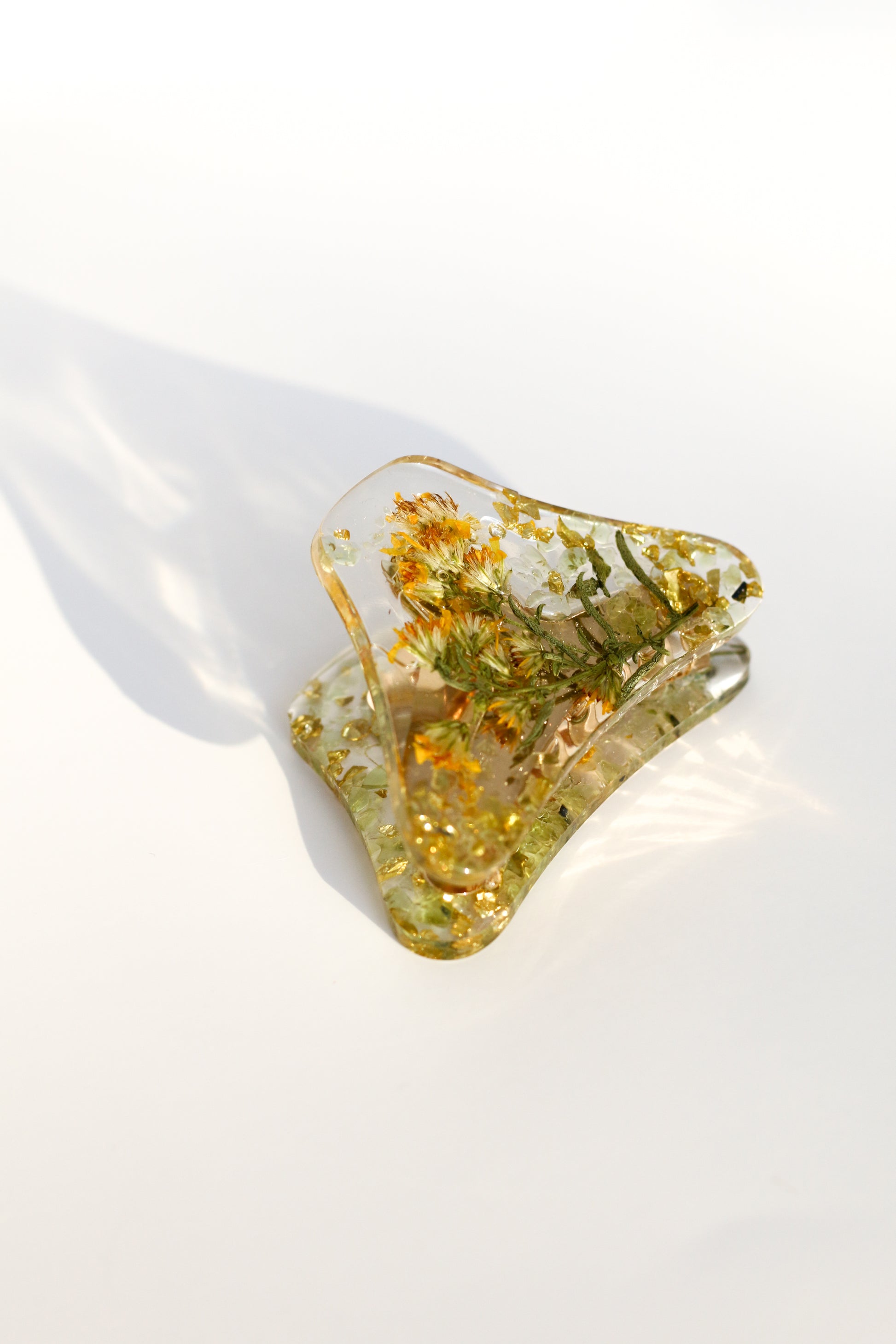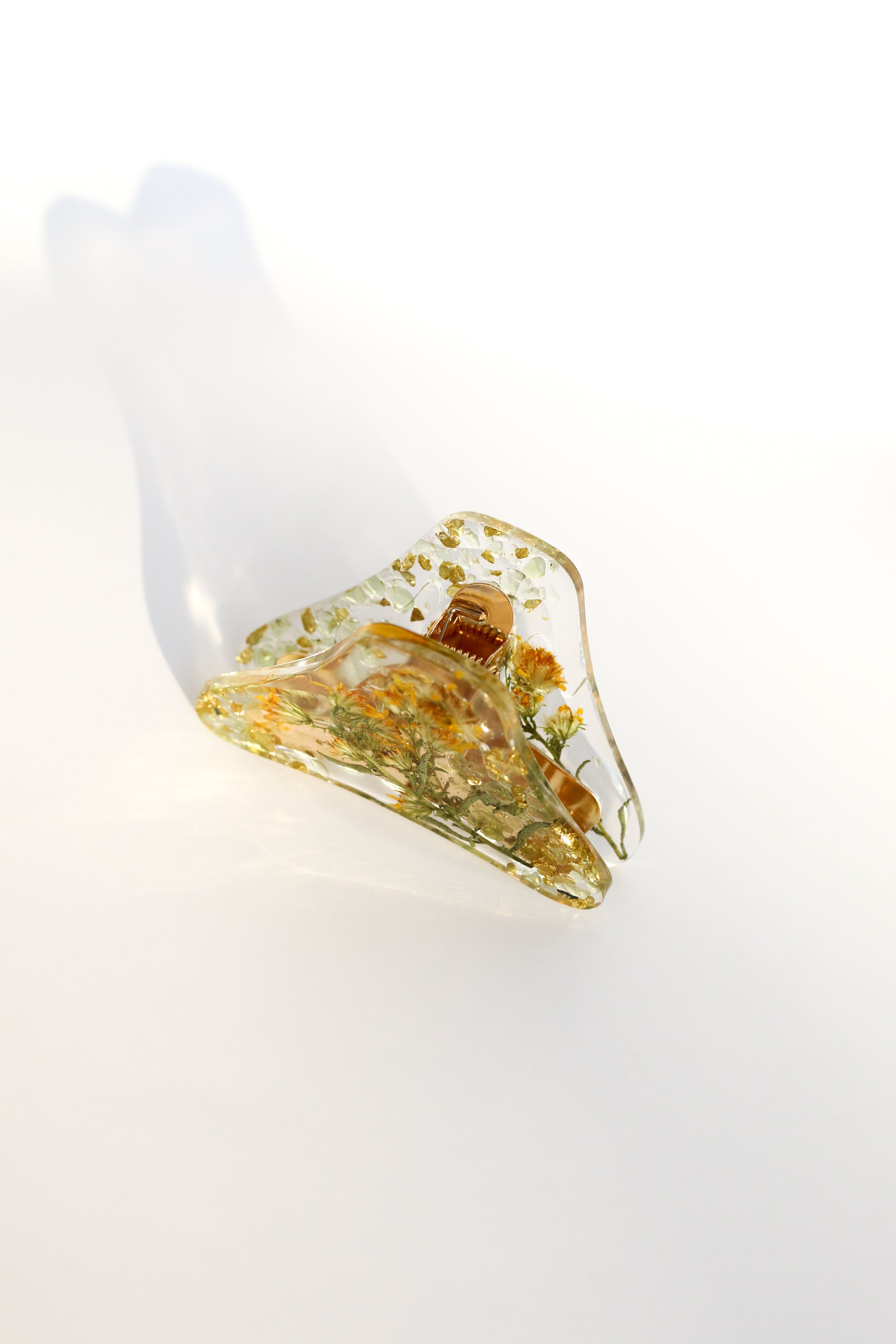 Pince à cheveux incrustée de fleurs jaunes cueillies localement, et d'une pierre fine verte pastel, la péridot. Un accessoire à cheveux original, proche du bijoux.