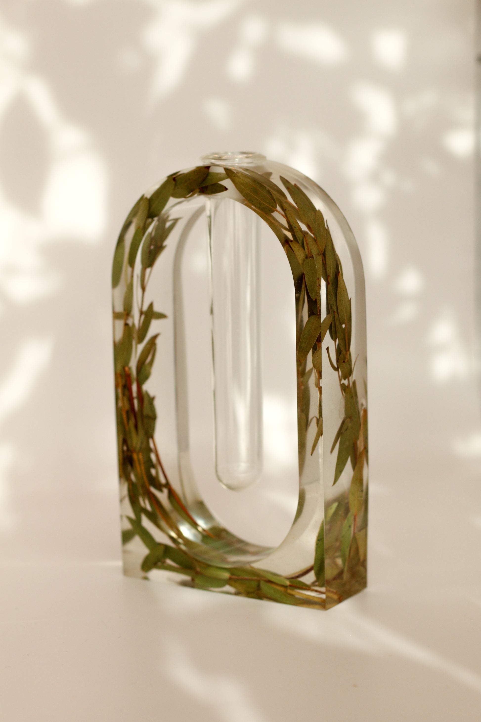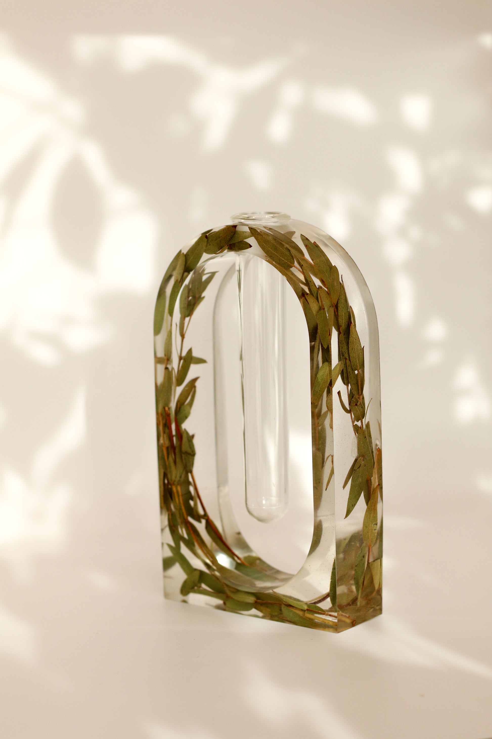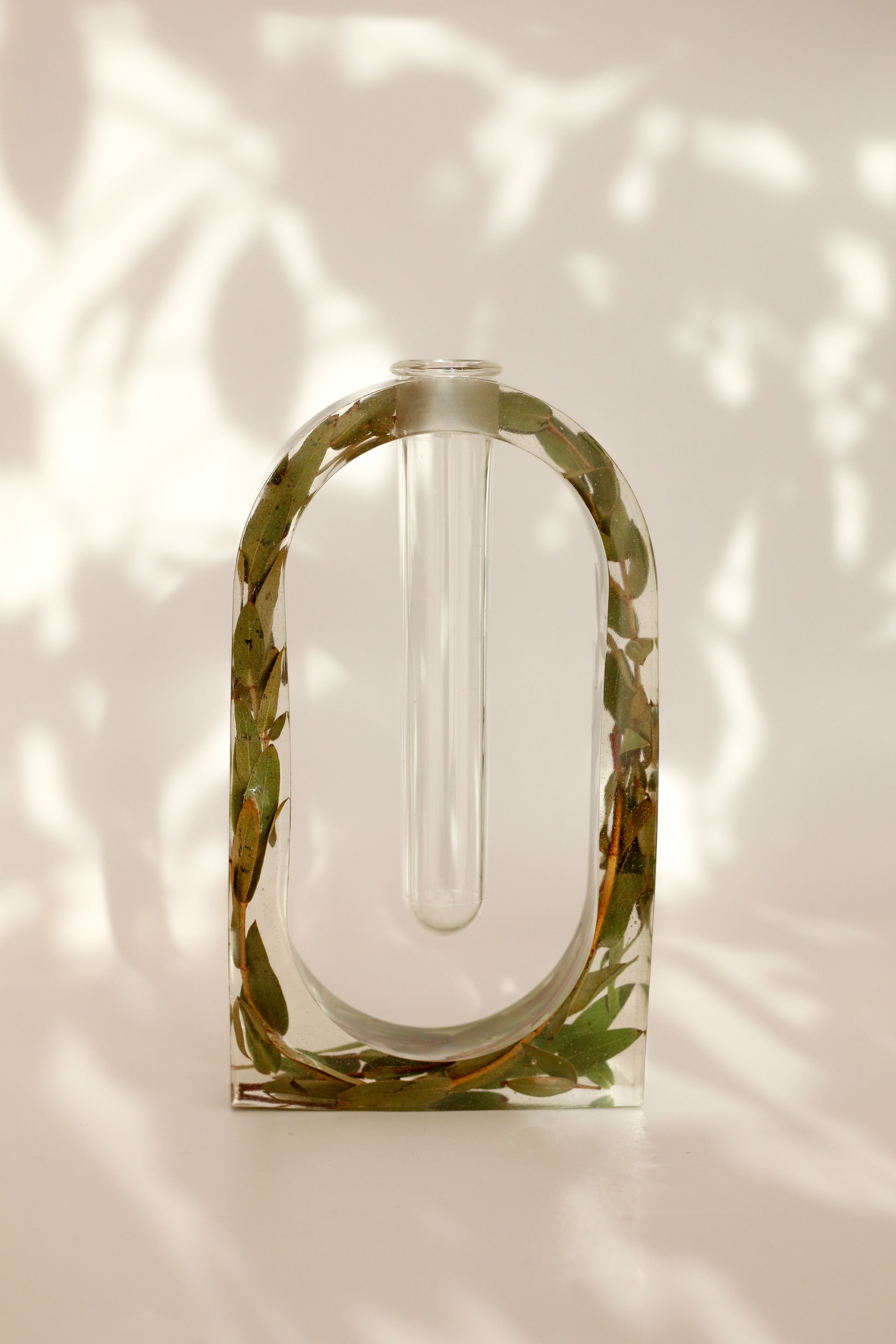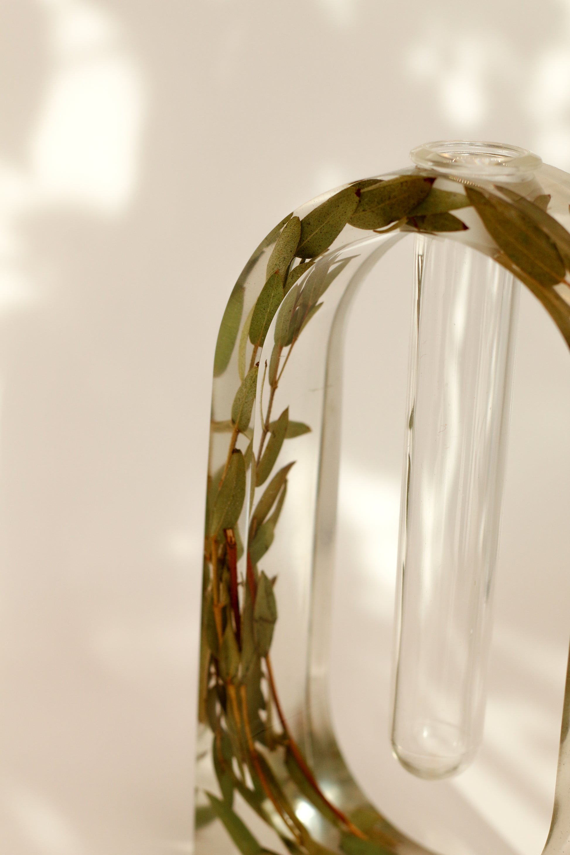 Un vase style soliflore, de forme demi-cercle, composé d'eucalyptus.